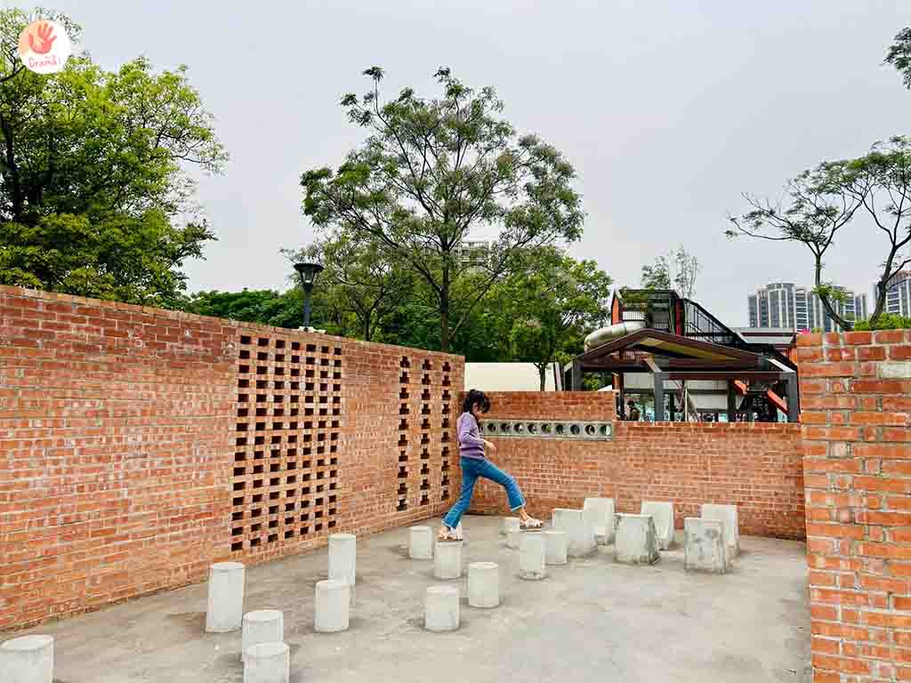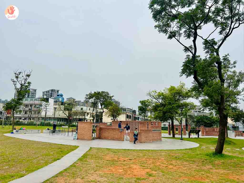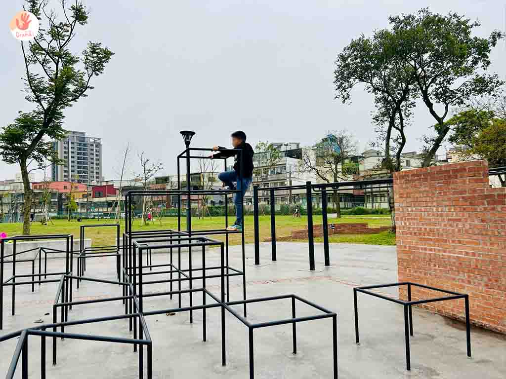 [楊梅四維兒童公園]3層樓高塔旁的紅磚圍牆設計成眷村感遊戲場,結合體能跑酷的設施,非常考驗小肌肉
