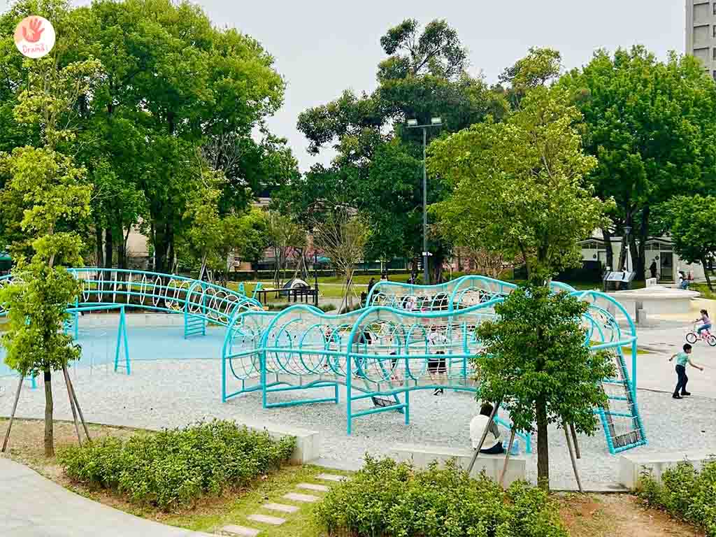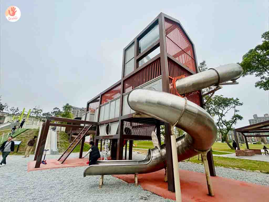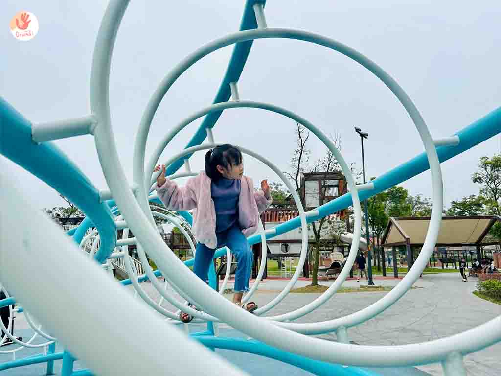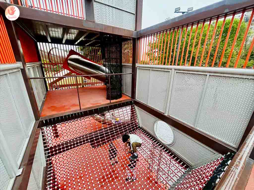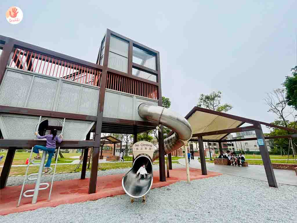 [楊梅四維兒童公園]打造3層樓高的眷屋基地遊戲場,攀爬網體能挑戰,溜滑梯除了鑽龍也可以選擇走樓梯,讓小幼童也可以共融一起玩