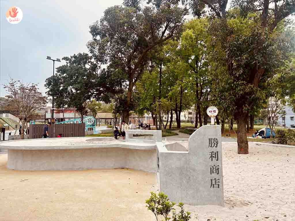 [楊梅四維兒童公園]沙池區的名字以眷村時的商店命名很可愛,愛玩沙沙的帶上工具也要記得多帶一套衣服來換