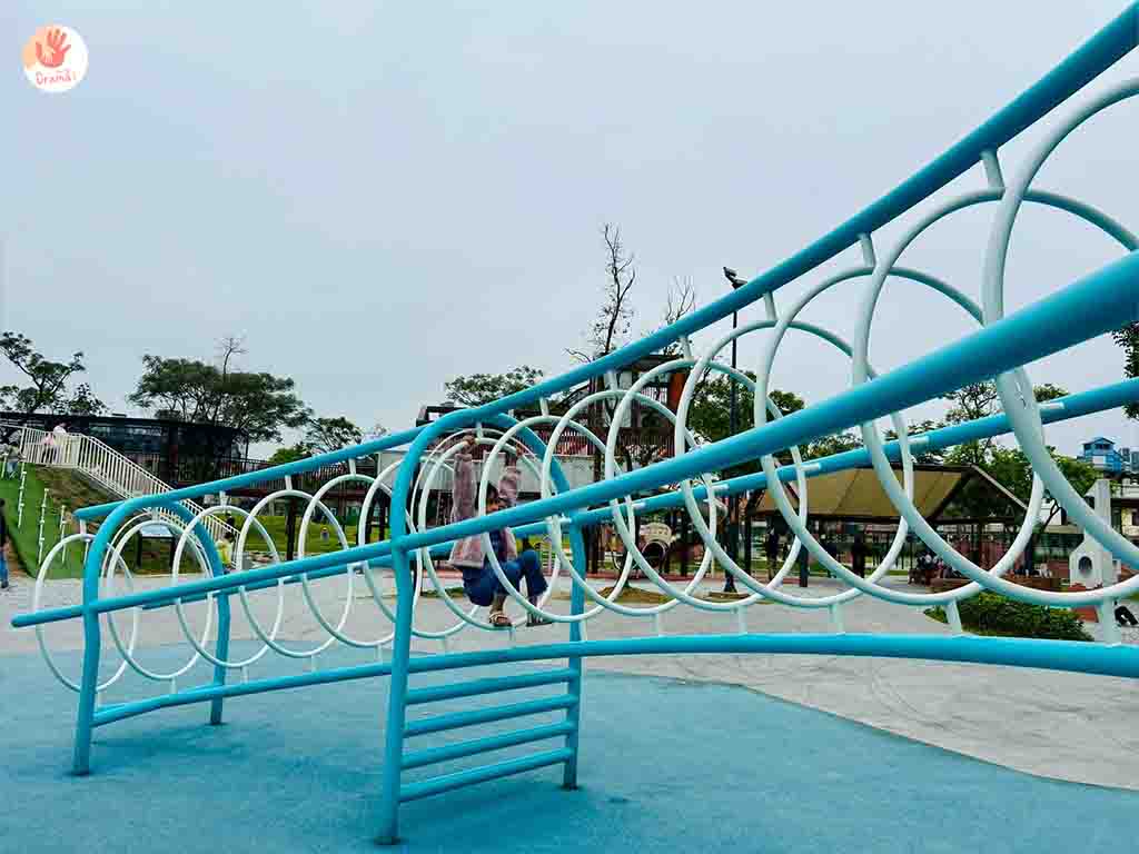 [楊梅四維兒童公園]圓柱間距還蠻大的,抓妹說~哇這個沒跳好就會頭破血流吧,只能說跑酷玩家心臟真的很大