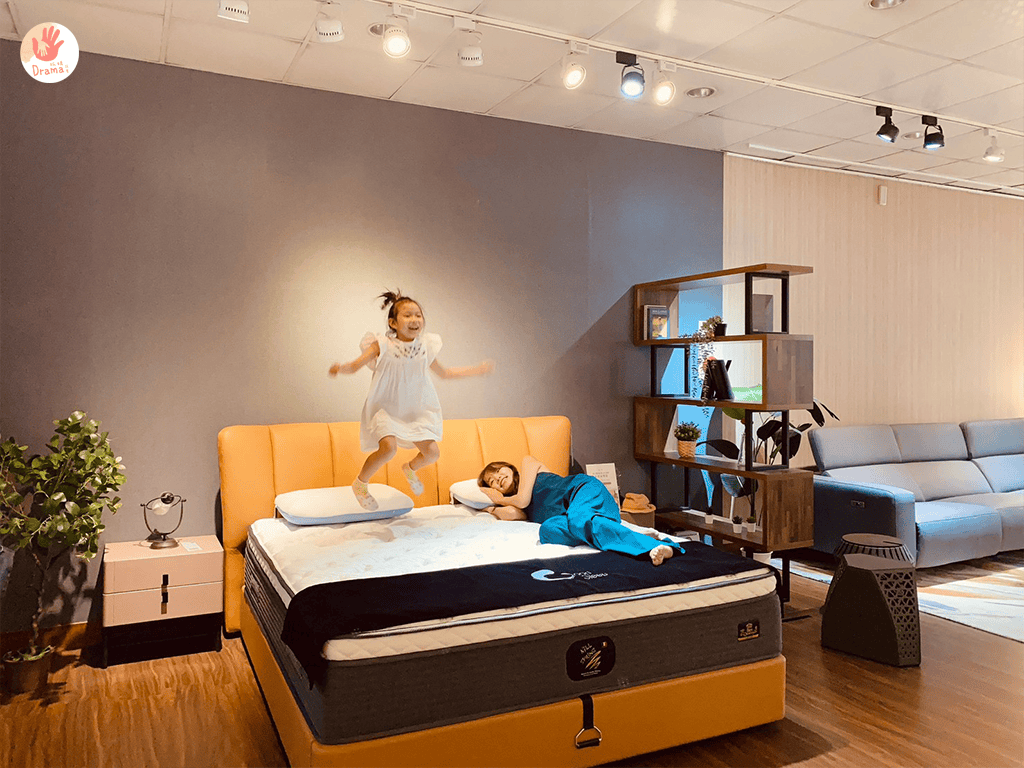 現在都流行測試,一個人睡覺一個人跳躍看看另一個人會不會受影響,一張好床還真的可以讓愛翻身的減少打擾另一人的睡眠,我們家女鵝可是跳得狂,看看她的頭髮有多飛,哈哈哈