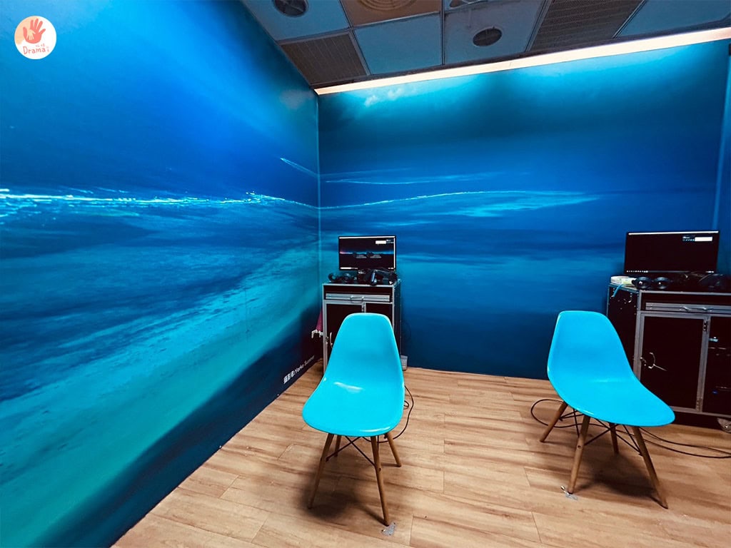虛擬VR有分二種,一種是探看海底世界尋找王子號,這裡是密閉的空間,所以其他人看不到,女鵝在門口等爸爸