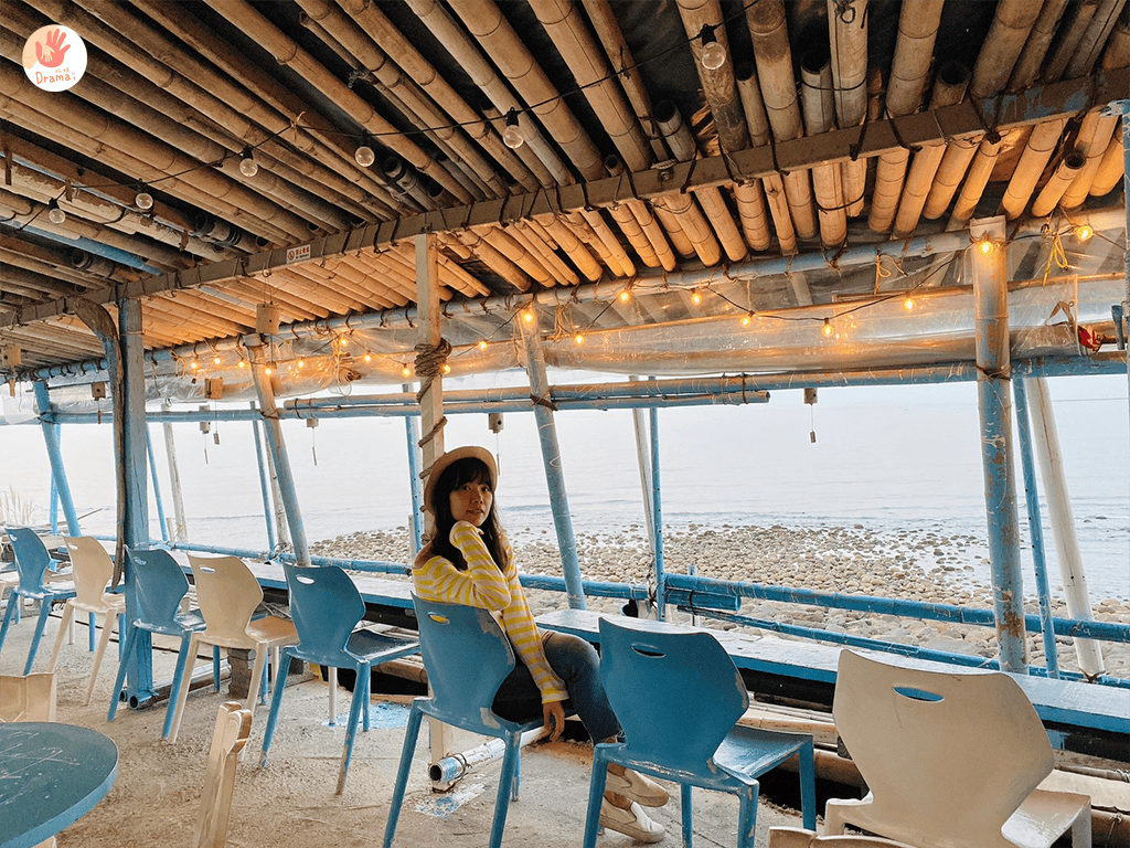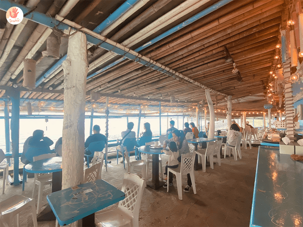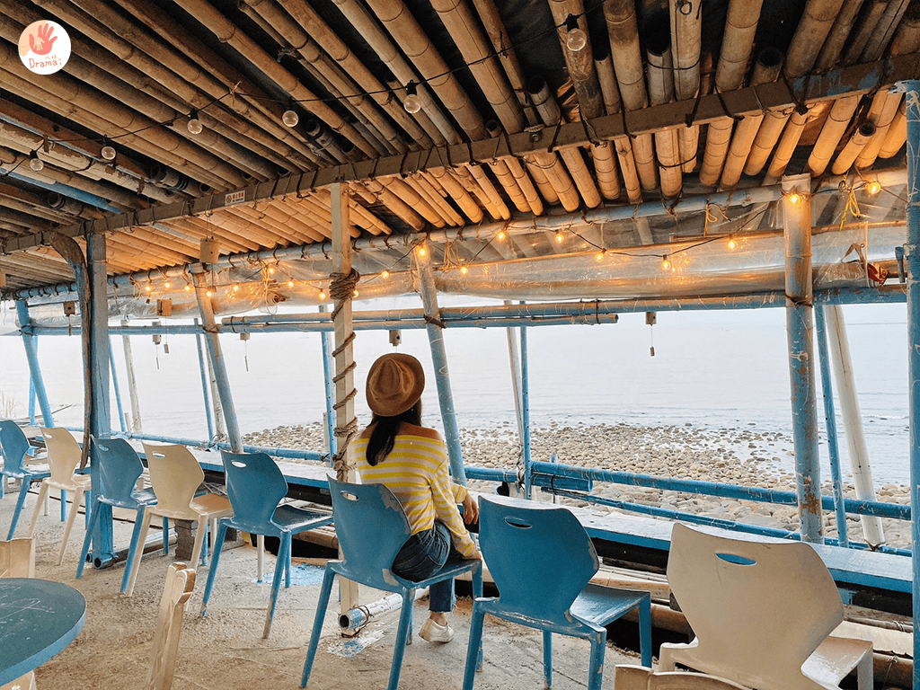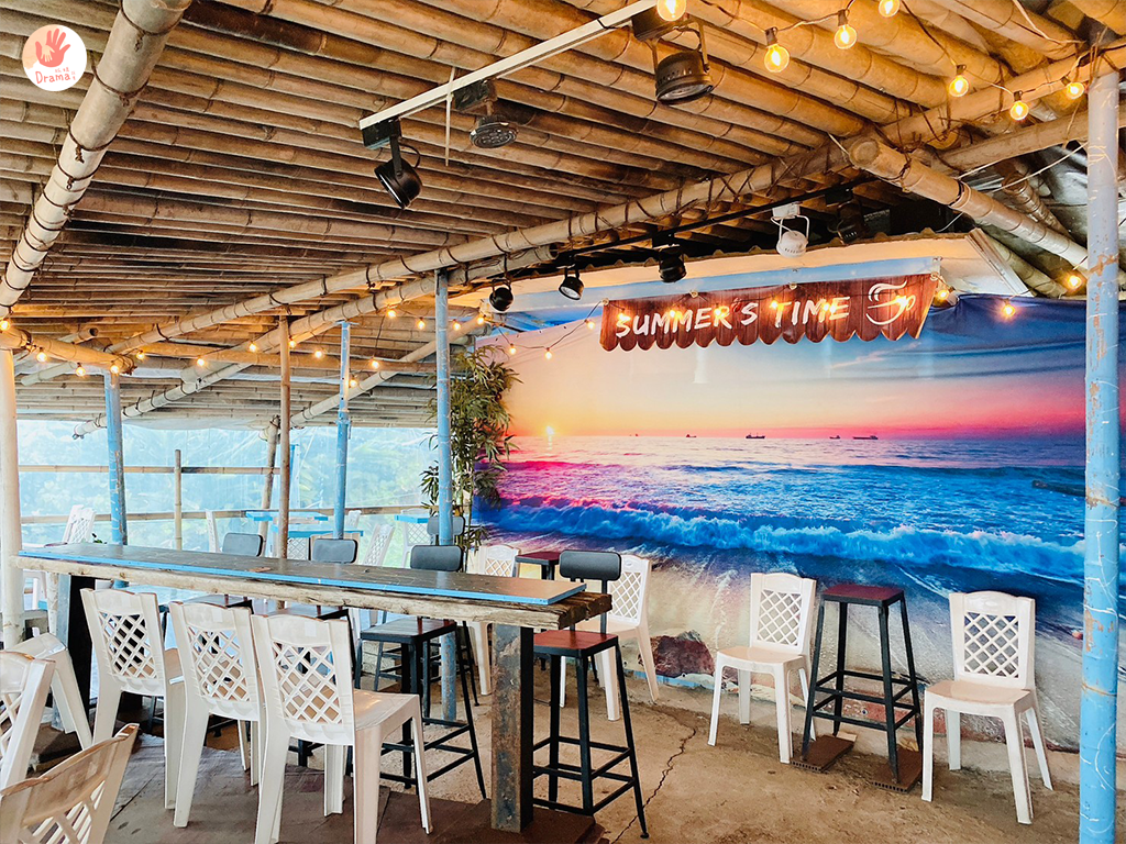 面滿的座位區,用竹子的搭建塗上了藍色和白色,就有讓人視覺夏天感