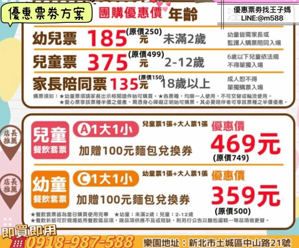 跟王子媽購票優惠如下圖(點這裡)可即買即用早點預約登記,假日大人小孩都要票,跟王子媽購票大人陪同票135元