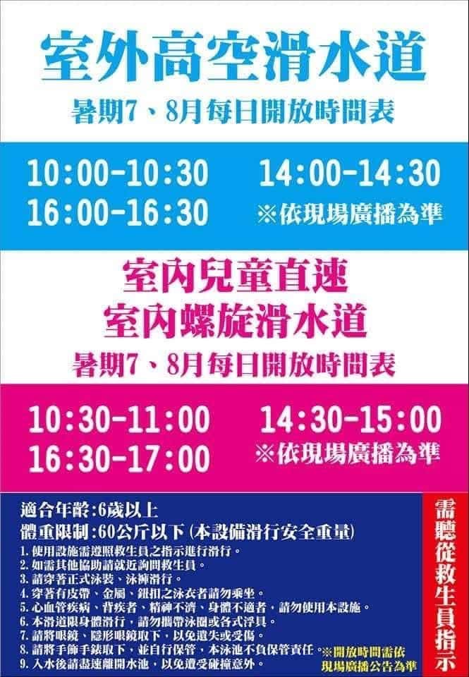 - 戶外高空滑水道開放時間10:00|14:00|16:00,每時段開放30分鐘