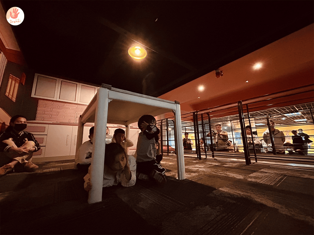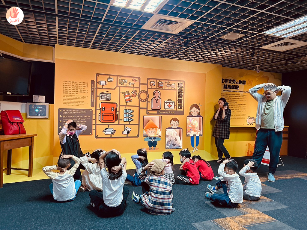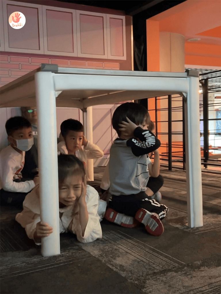 地震來臨時要先保護頭和頸部,小朋友都很認真學習,還記得了口訣,趴下/穩住/掩護