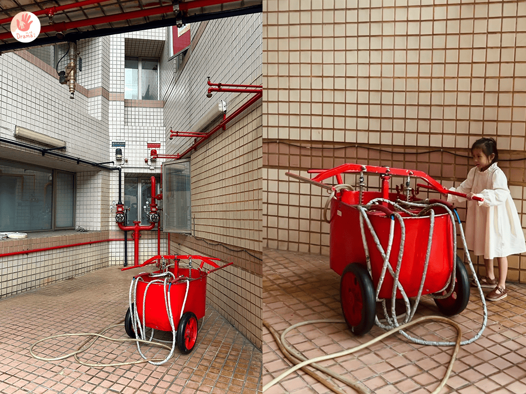 當日來訪時因為外面有下小雨,所以壓水車活動就取消,我請導覽員帶我到現場看一下,因為實在好奇壓水車長什麼樣,這壓水車可是要團隊合作的,如果只有一個小朋友是不能成功,導覽員說至少要4位小朋友一起合作