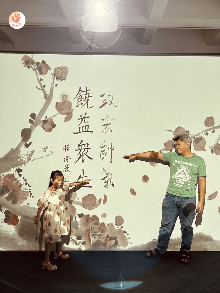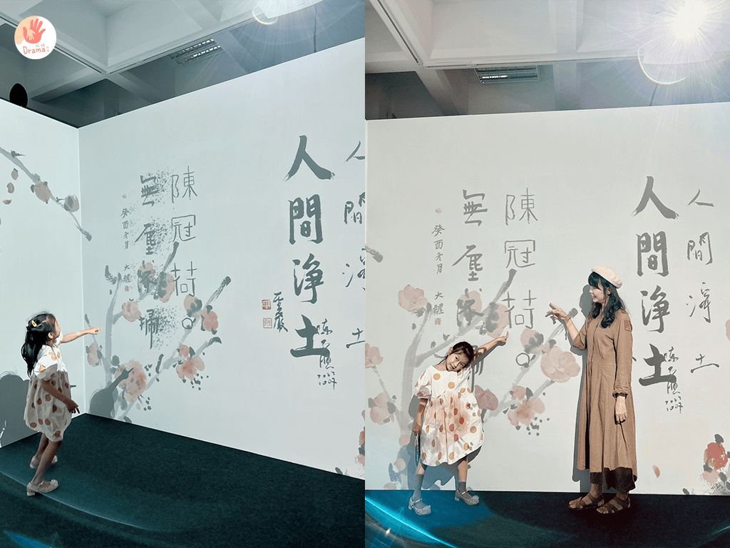 一樓展館,提供書法筆可以讓大人小孩寫下文字書法後掃瞄投影出來,女鵝會寫自己名字了,所以我們就讓她寫名字