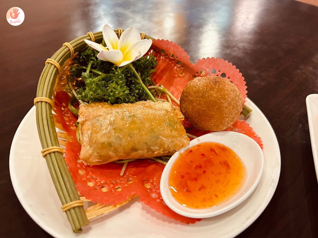 店員推薦必點的芋香大力丸和海鮮捲,芋香大力丸是芋泥丸包了韭菜內餡,海鮮捲就是腐皮捲包小鮮蝦和韭菜內餡,覺得二樣的內餡相似度很高,只是一個是鮮蝦一個是芋泥,覺得相似度很高有點可惜,寧可滿滿全芋泥,那會更讓人想念