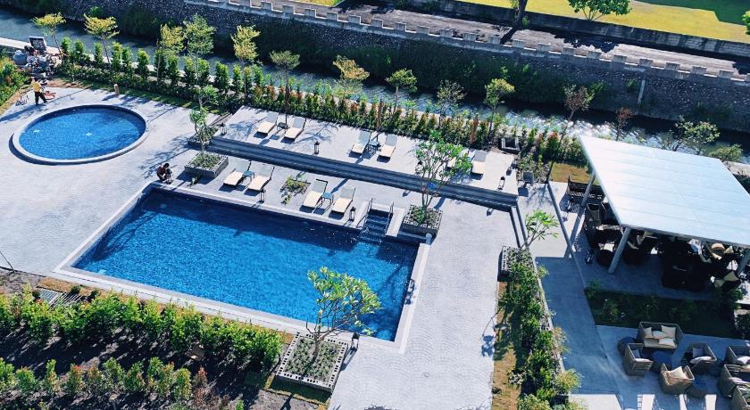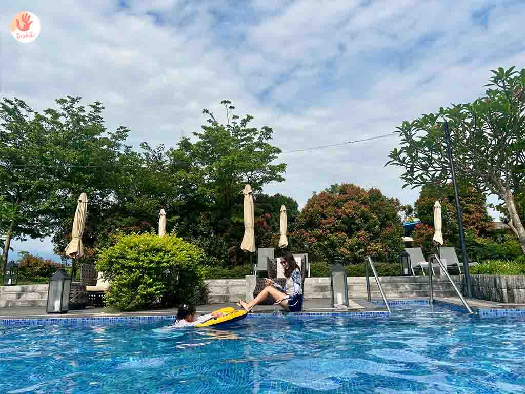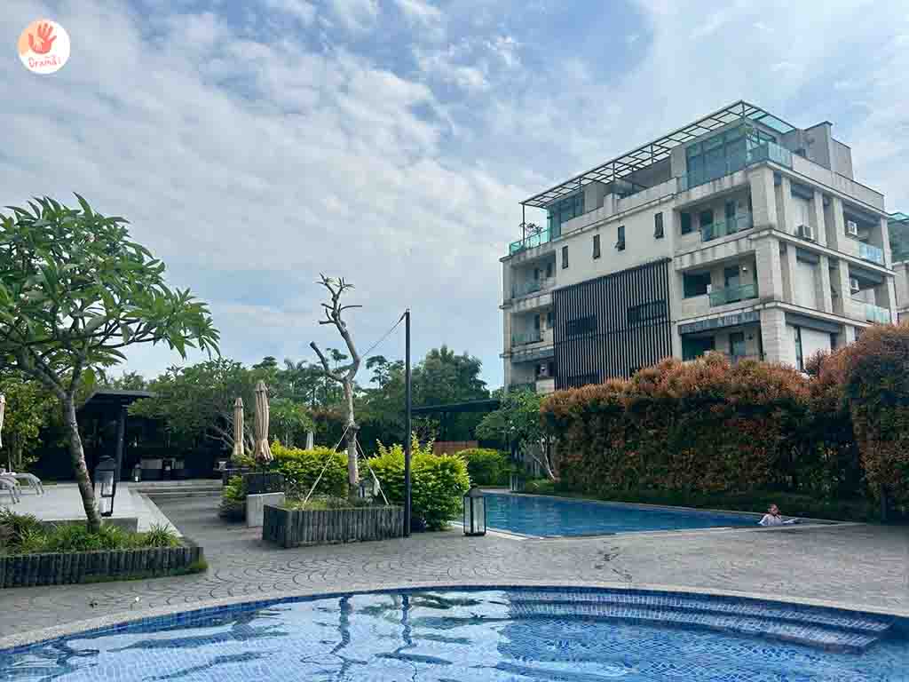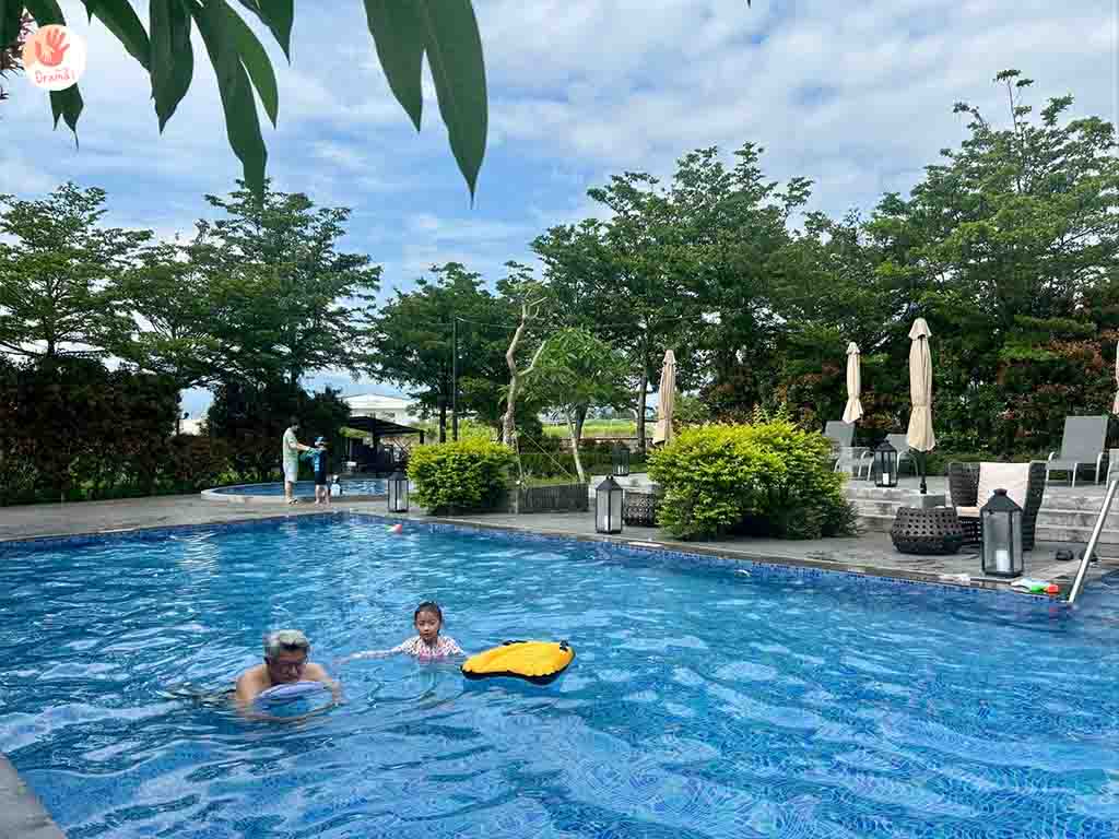 [藏闊渡假會館]戶外的泳池沒有遮棚所以夏日要注意防曬,但直曬的泳池水溫很剛好,不會玩到發冷是蠻孿的,泳池池畔還規劃了發呆躺椅,大人也可以很放鬆