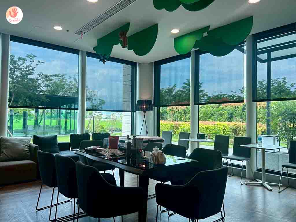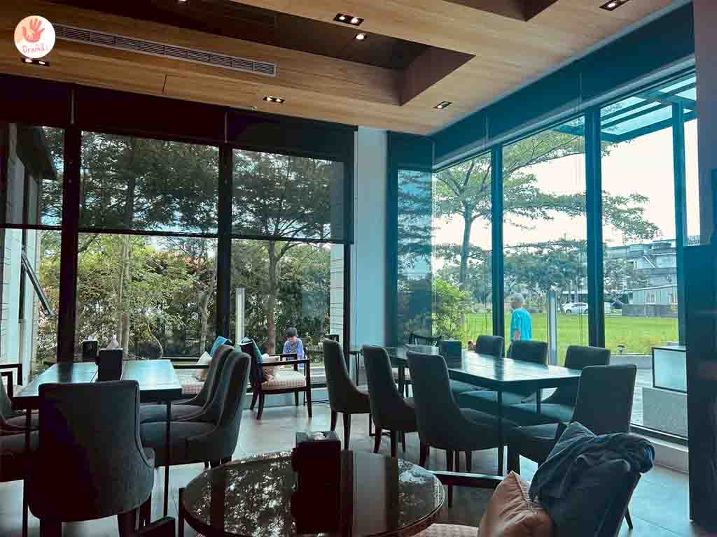 [藏闊渡假會館]早餐是採分流,分別有八點和九點時段,全落地玻璃窗戶外的稻田綠意景觀,讓早餐環境視野廣闊很放鬆