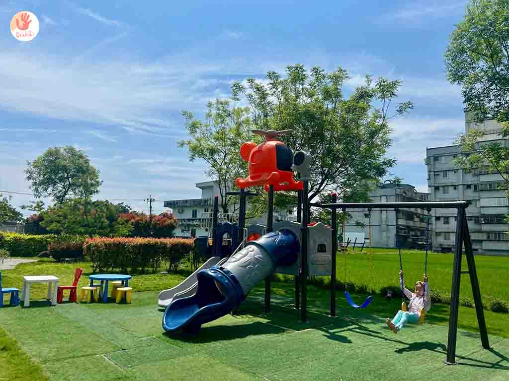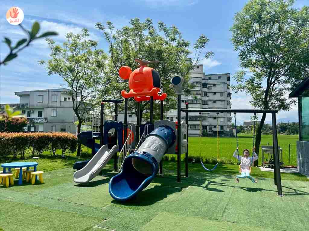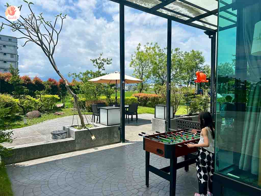戶外區還有手足球桌及鞦韆溜滑梯,想要曬太陽遛小孩晚上好睡覺,也可以在這裡玩一波