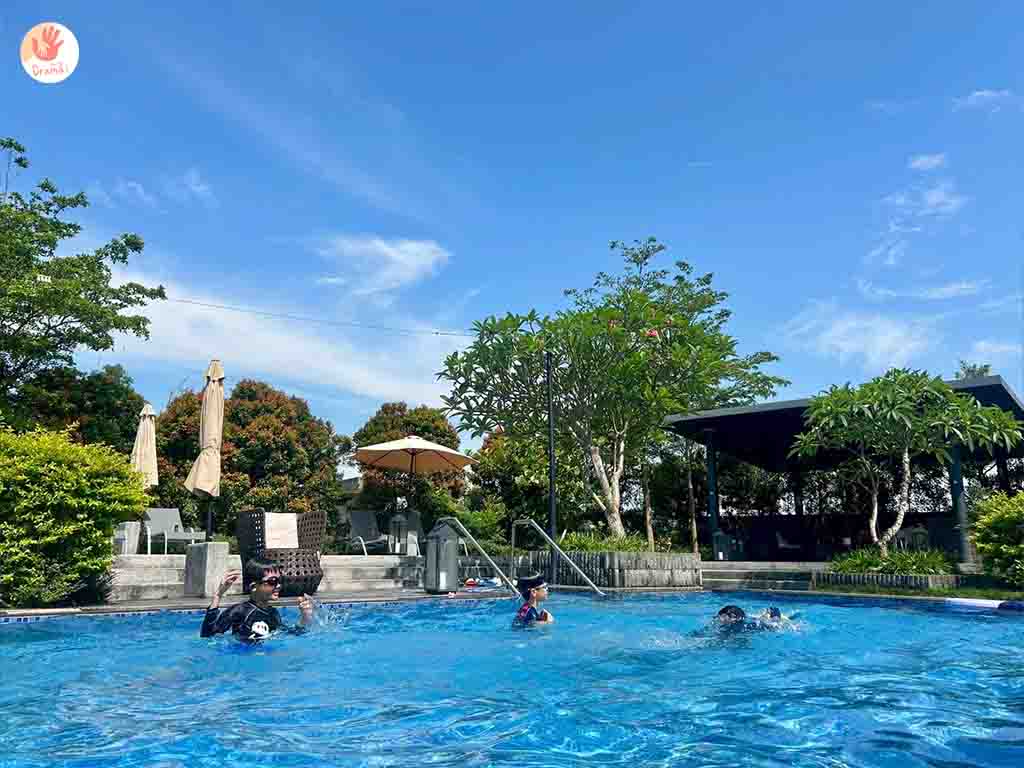 [藏闊渡假會館]戶外超大泳池分別有水深90公分及兒童池水深40公分,有穿著泳衣入池,自備水上充氣游具,[藏闊渡假會館]備有打氣工具