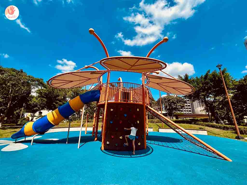 盛開的花朵,以同心圓在不同放射區有不同的放電攀爬設施和溜滑梯,很適合考驗小肌肉