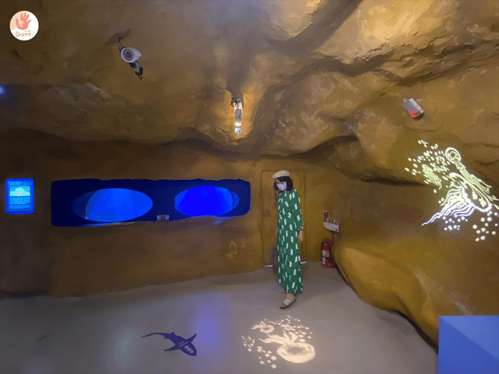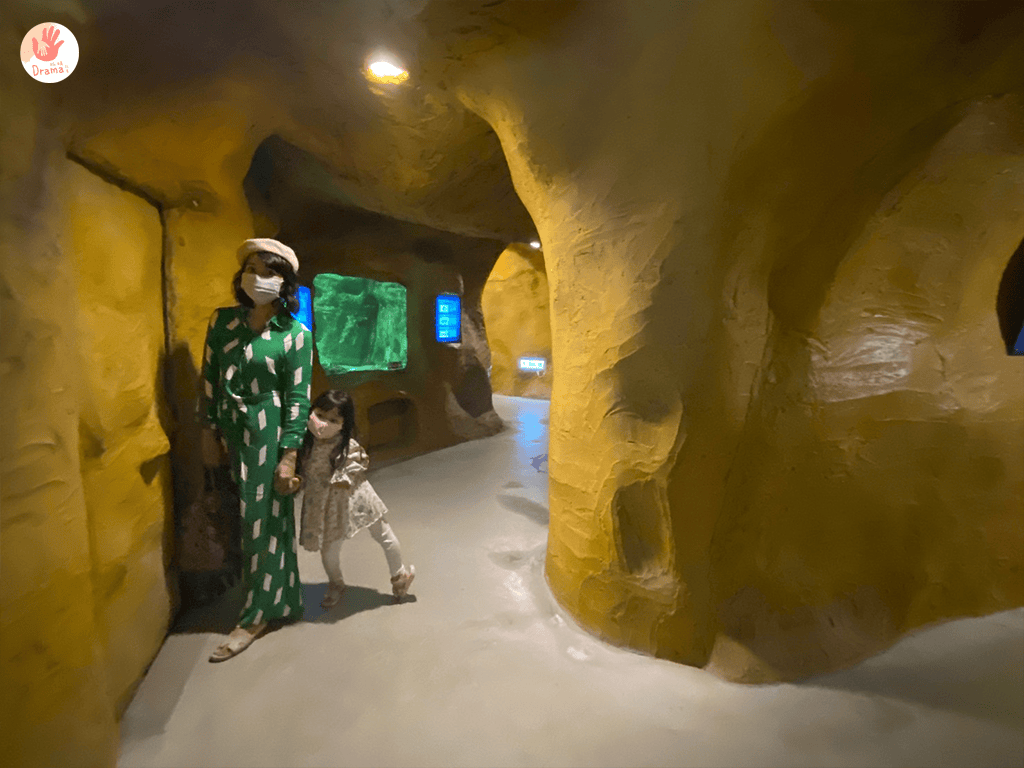 野柳海洋世界的 [海底世界探索館 ]設計是呼應野柳地質風景區的岩石設計,所以地下的通道設計很有進入奇岩石洞,走起來是蠻有探險的FU,隧道長度約一百多公尺是真的小而巧