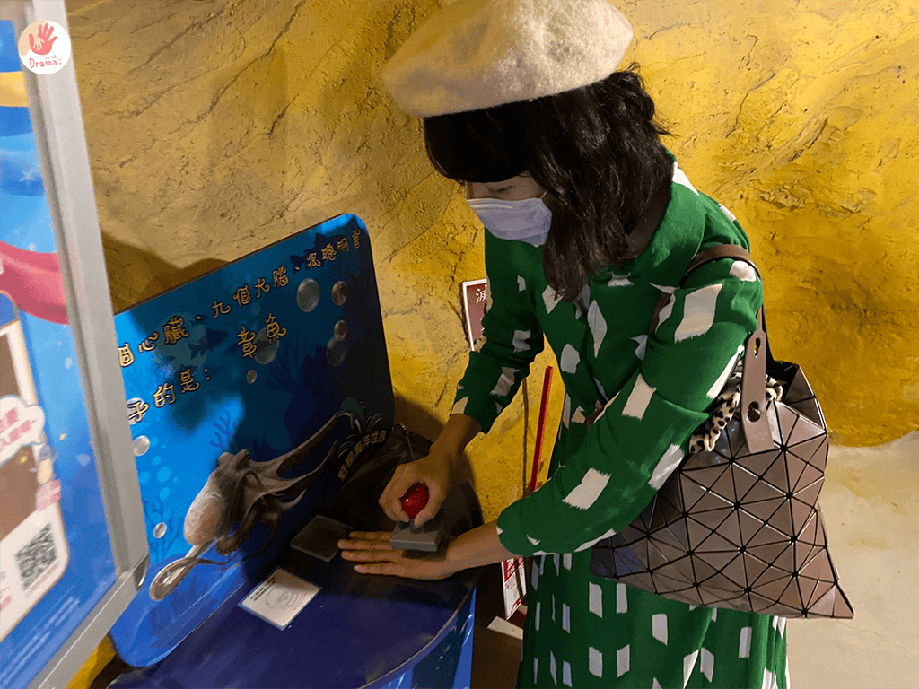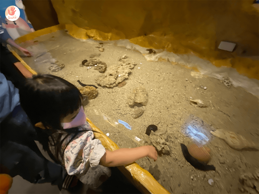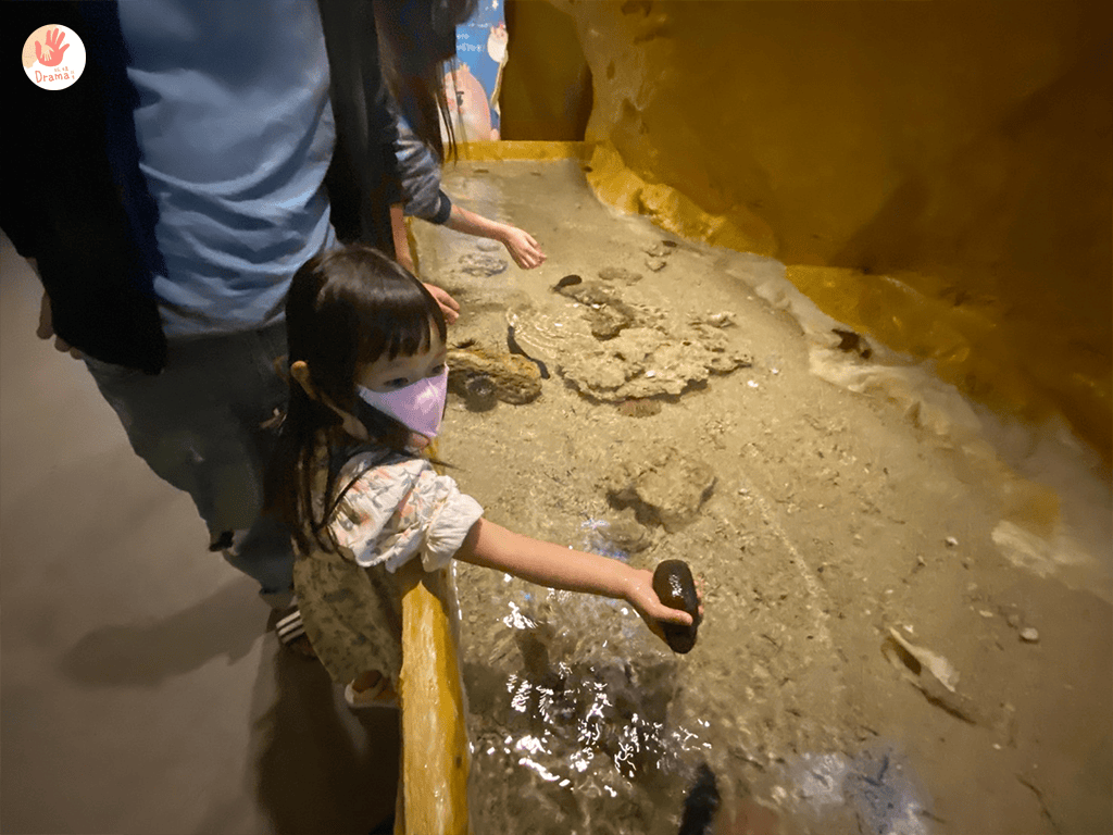 裡面有海星、河豚 、 海膽 、 海蔘這些都是可以觸摸的,裡面的河豚超級超級可愛,牠的尾巴游起來攞動超快,模樣可愛極了,在體驗前要先去一旁的洗手台把手洗乾淨,女鵝在這一區玩得很開心
