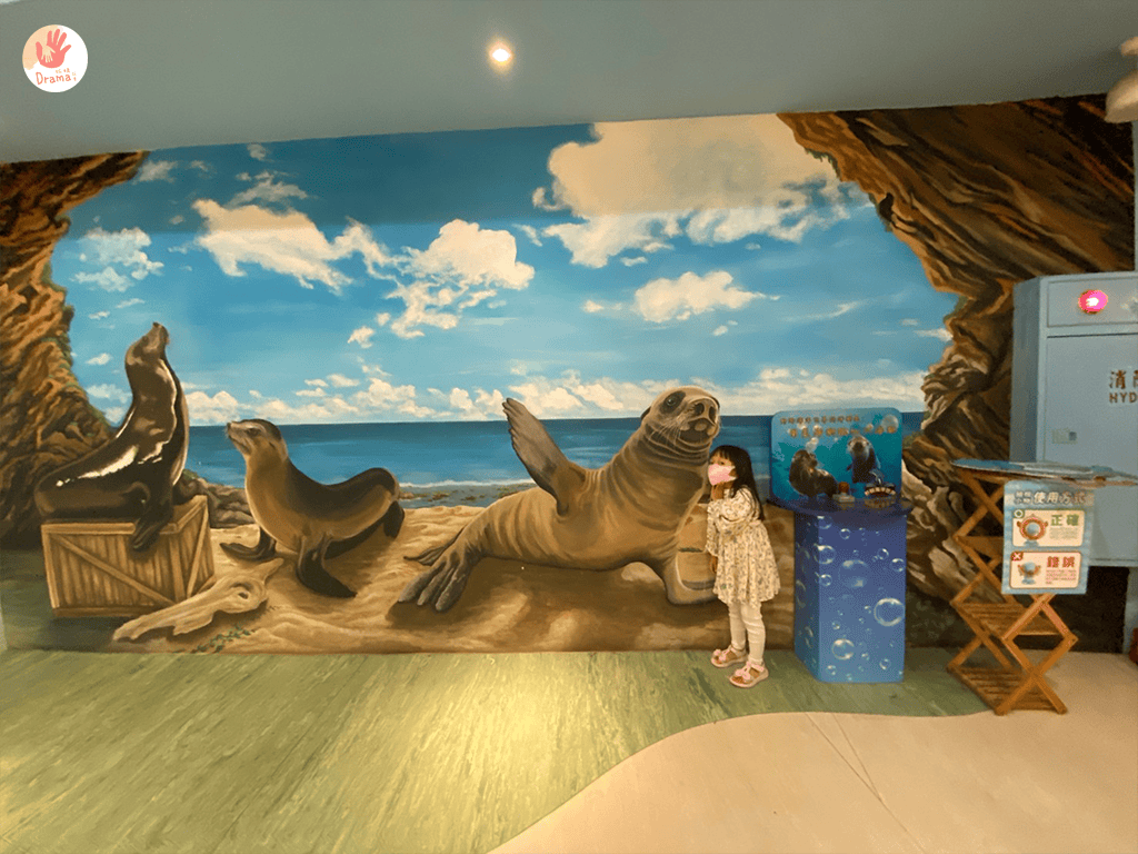 B1是看海底世界動物也有觸摸區,2樓是戶外海豚+海獅+跳水表演,我們是在蝦皮找套票,會比較優惠,最近新規劃了[童樂趴]就是親子館,顏色都是很粉嫩的馬卡龍色。