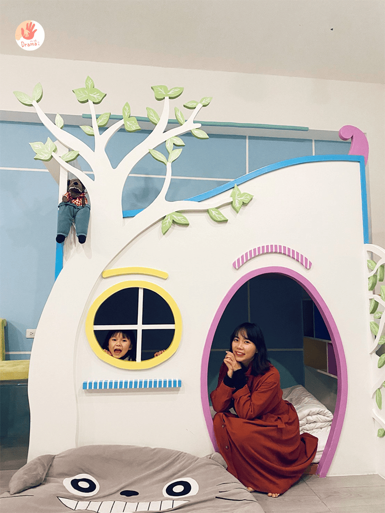 這間房有滑梯,還有一個龍貓,女鵝自己躲來躲去玩得很開心