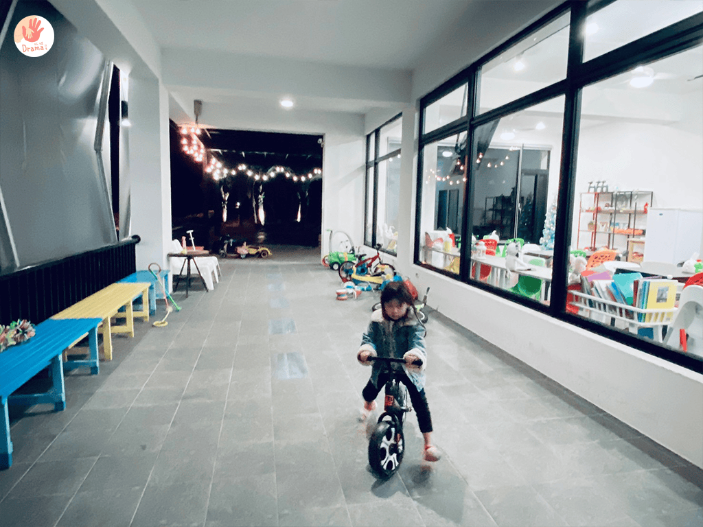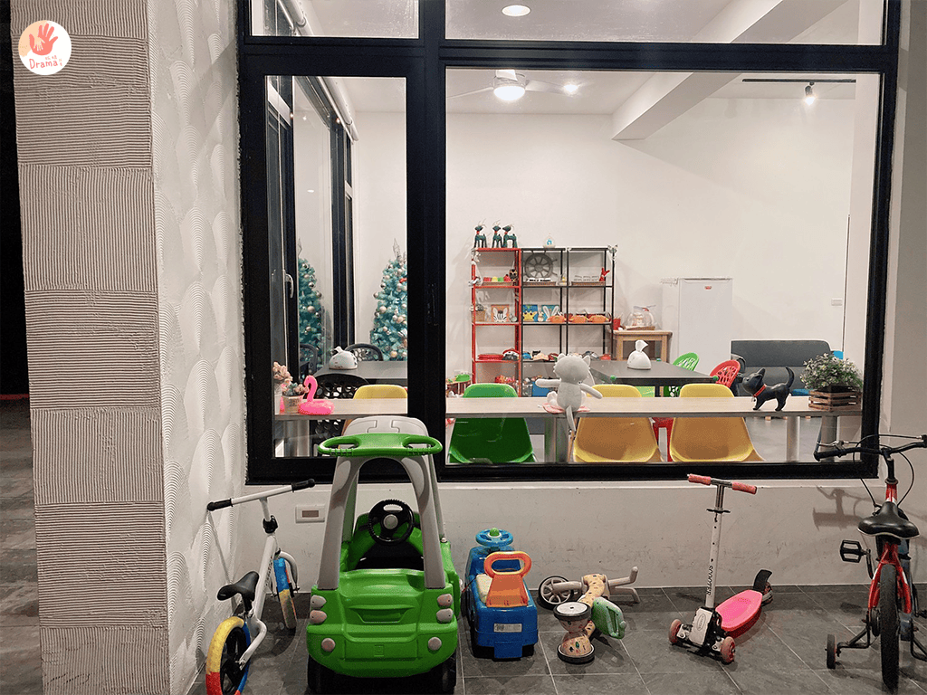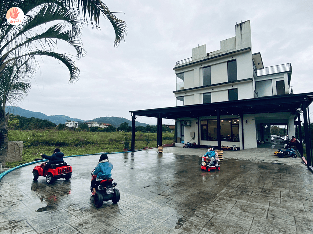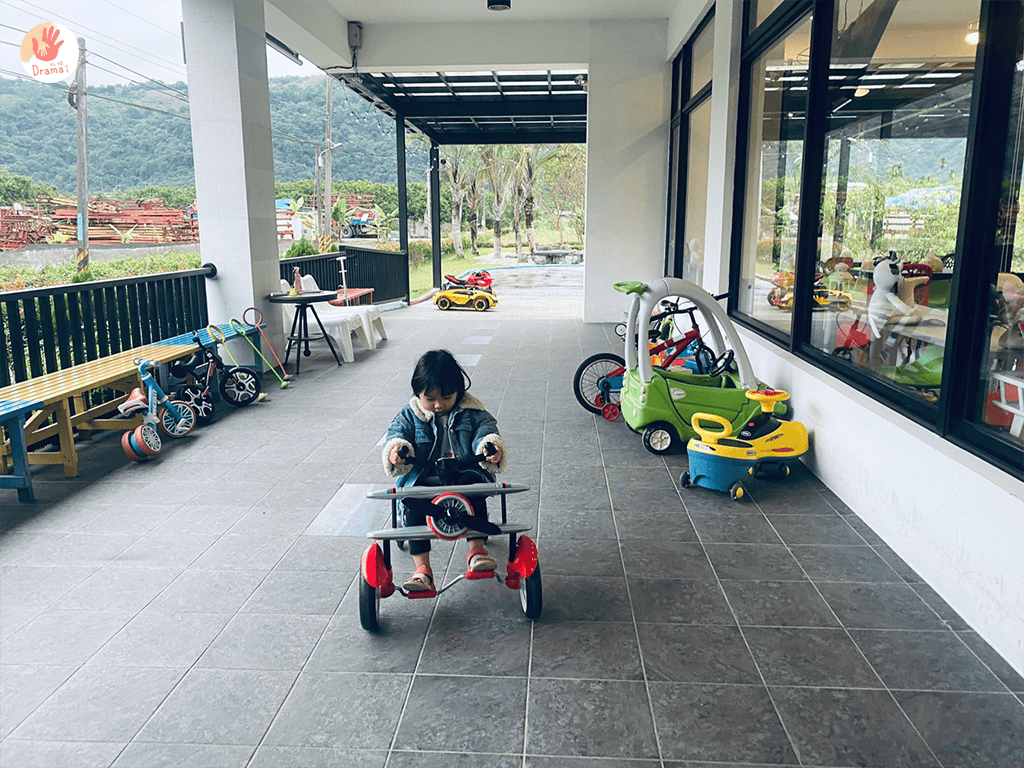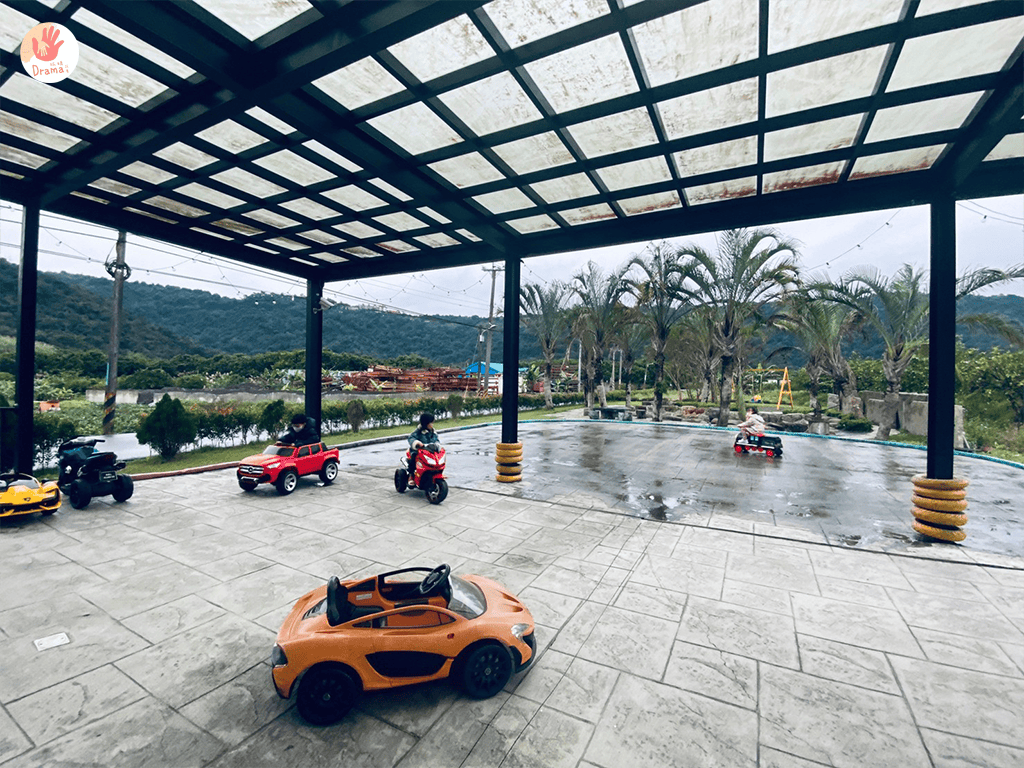 會選上這間就是有很多電動車可以讓孩子們爽玩,除了電動車也有滑步和滑板車,也要兒童羽球,有屋簷的主建物設計讓下雨天也一樣可以照玩電動車,幸好我們很幸運的這天很濕但沒下雨超開心