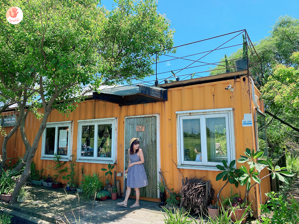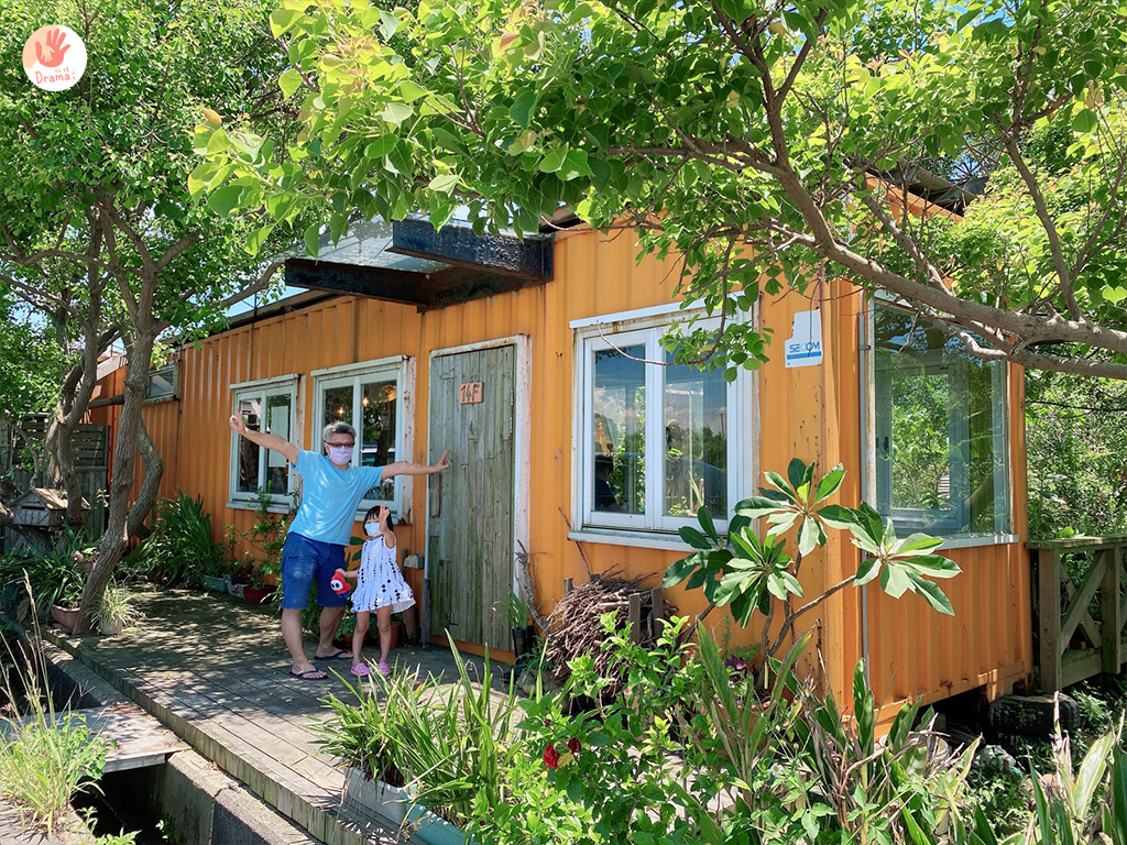 在稻田旁的橘色貨櫃屋,車子都停在路邊就可以,不用擔心要到14F只有1樓而已