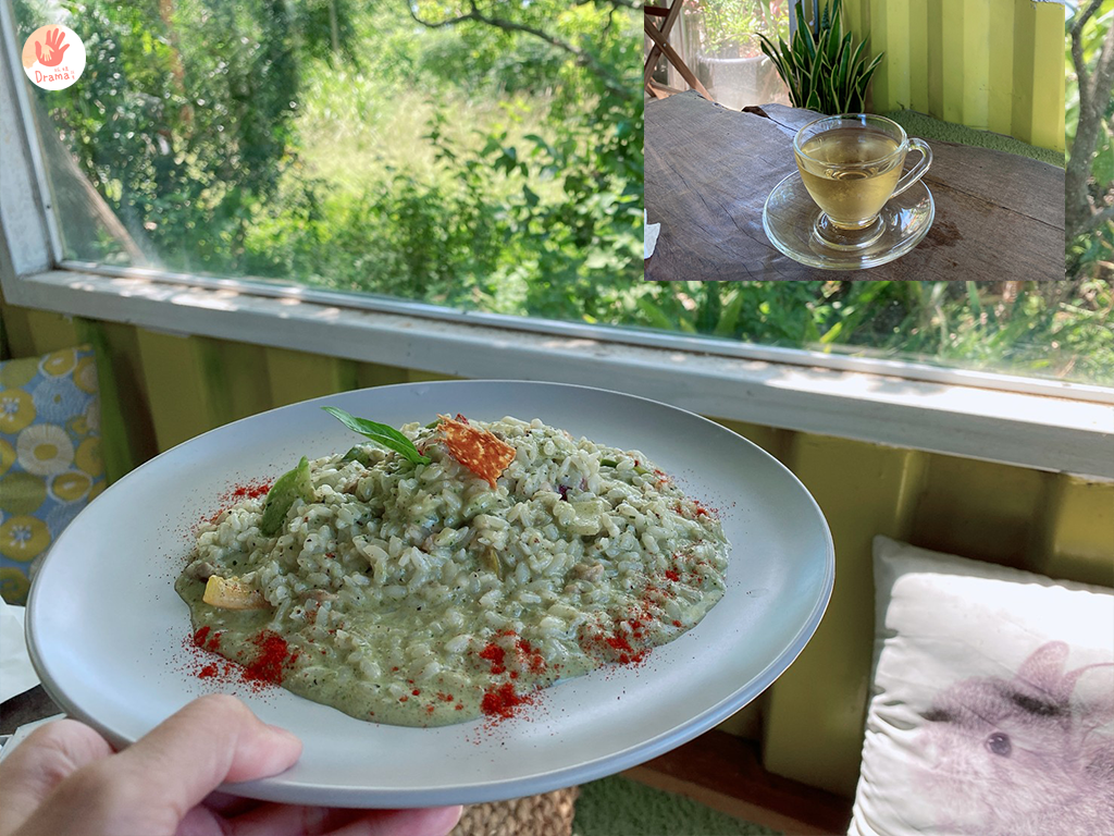 奶油青醬海鮮燉飯賣相看起來普通,但吃起來不得了,一口接一口停不下來,很美味,餐點有附飲料