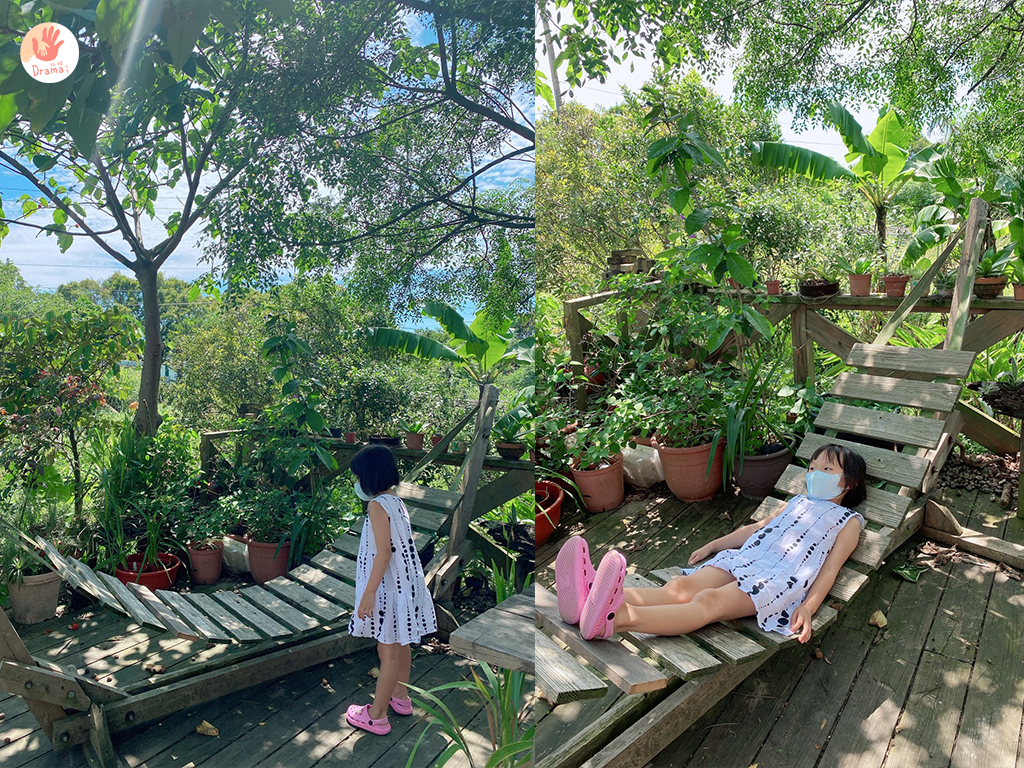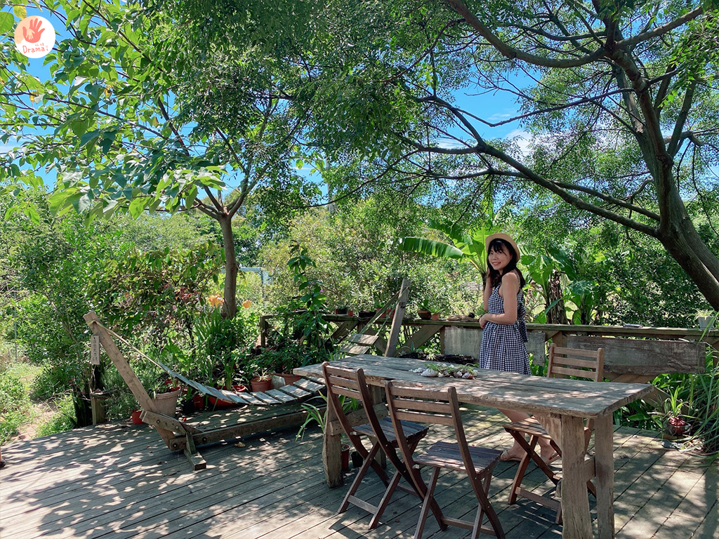 戶外有一個原始木板長桌很天然,在綠意包圍下,讓人很放鬆,但夏天真的好熱