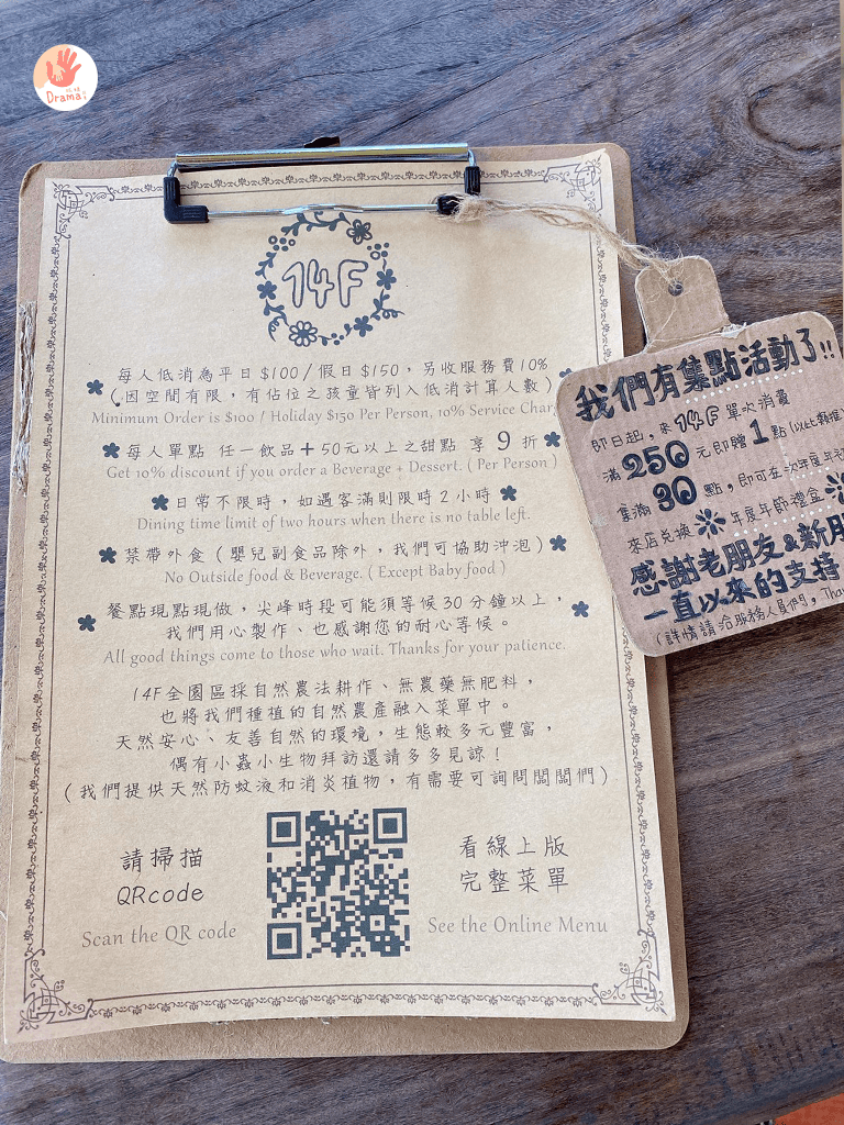 因為下午要去[觀音濱海遊憩區]踩水玩沙,所以找到這間迷人的餐廳[14F手作甜點。家庭料理]店名很可愛,但其實是在田野旁的一樓,全區採「自然農法」栽種,店內手作餐點也都盡量使用自產的安心農產,不定時更換菜單,重點都好好吃。