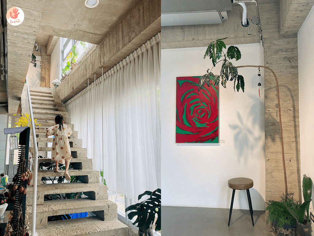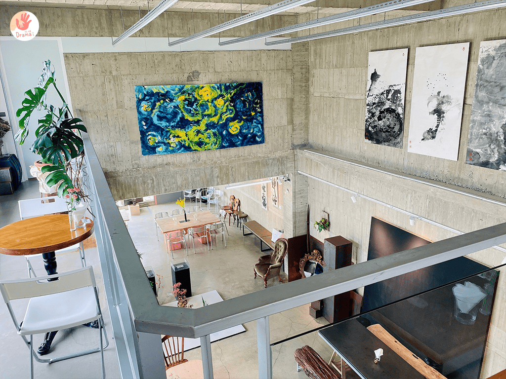 從二樓裸空的設計空間俯視,牆面結合藝術畫作及藝術作品的展售,真的彷彿走進藝廊般