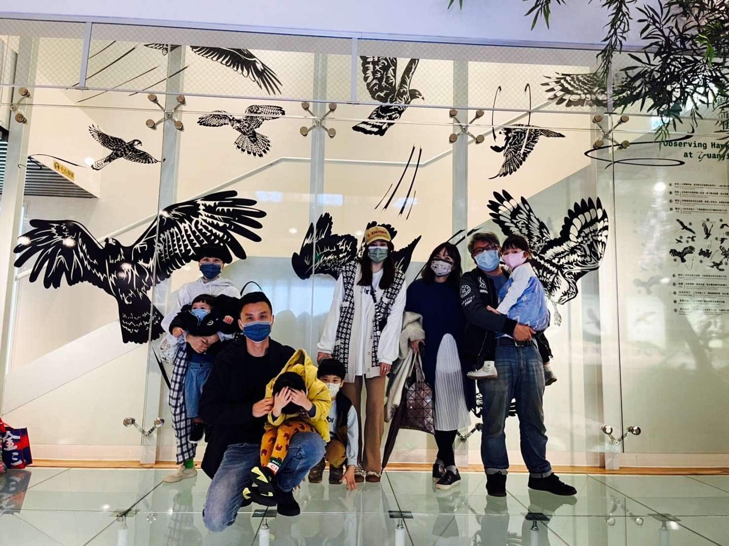 謝謝解說員幫我們拍的大合照,以老鷹在樹林的造景為背景,蹲低幫我們拍了好多張