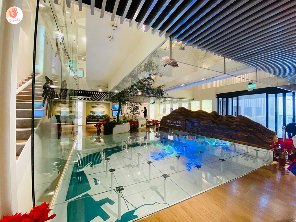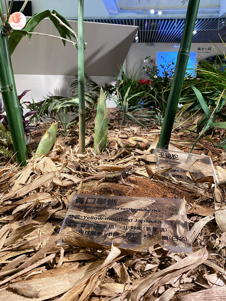 一樓展區空間以ㄇ字為動線設計,中間保留了山林和生態仿真的模型造景,讓視線覺得寬敞
