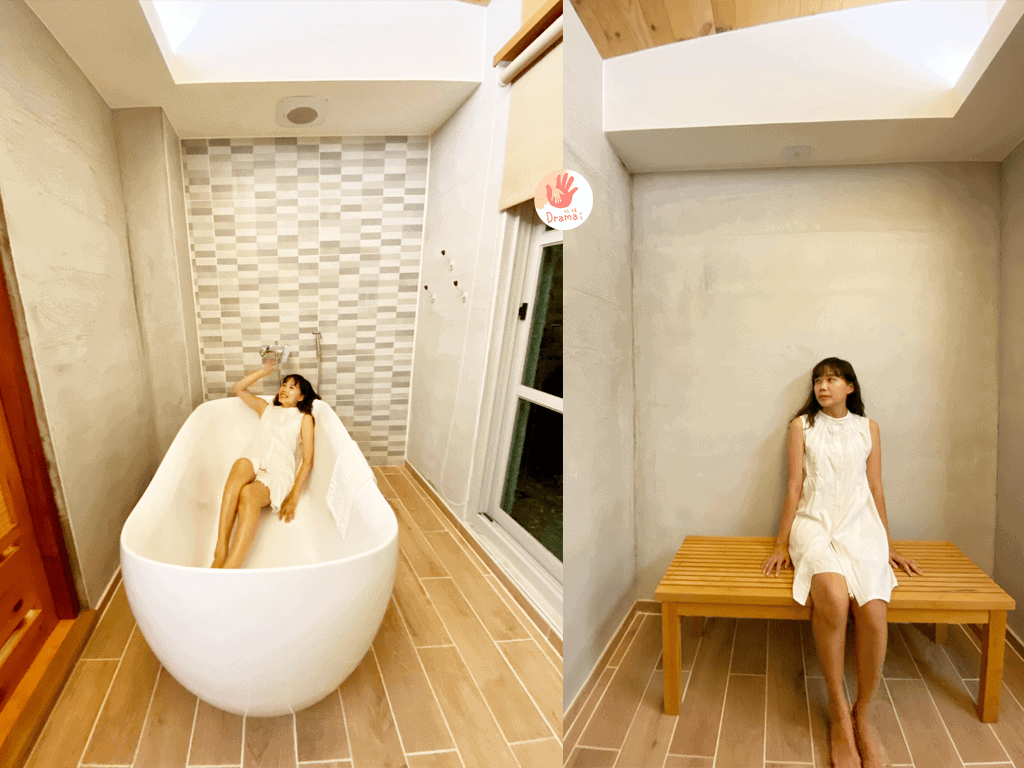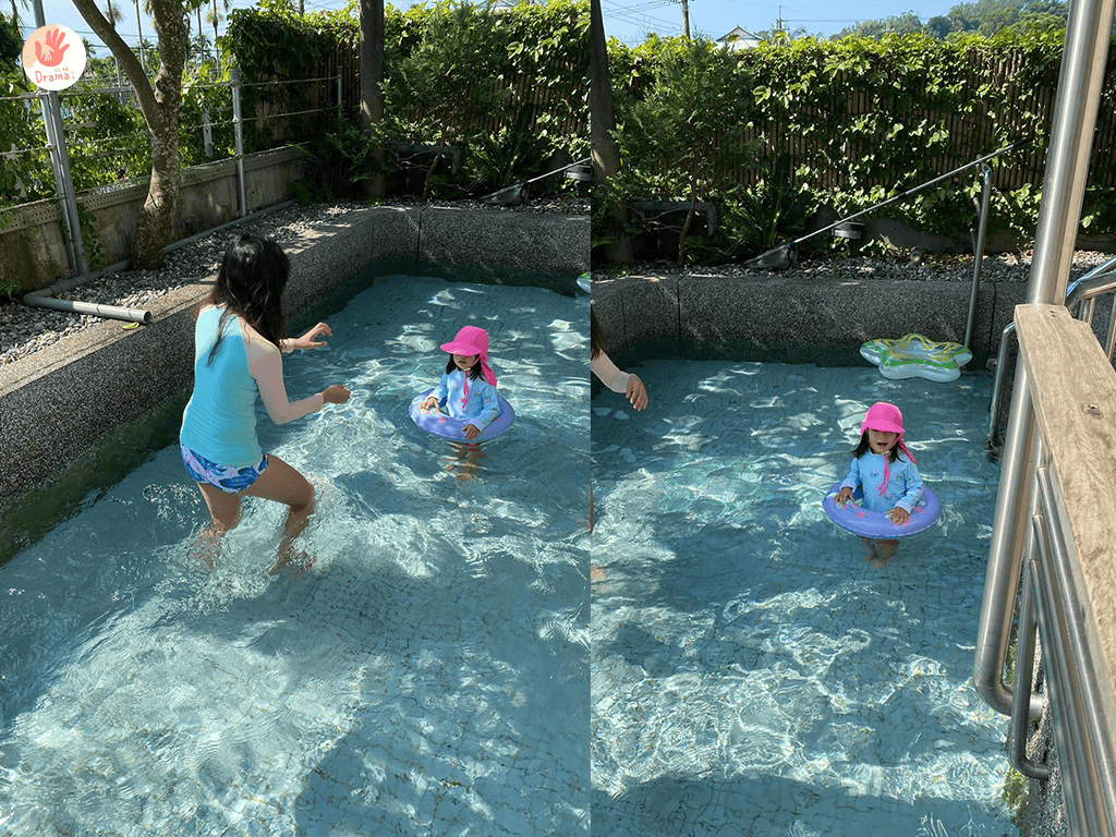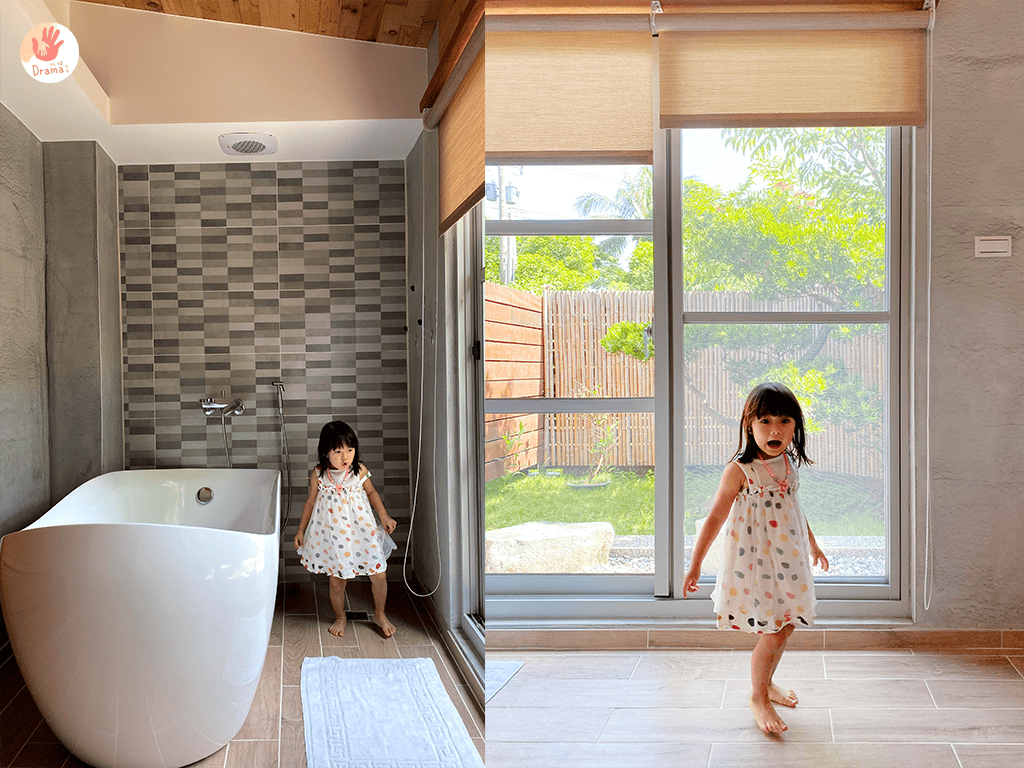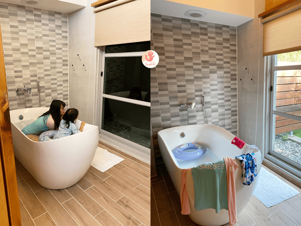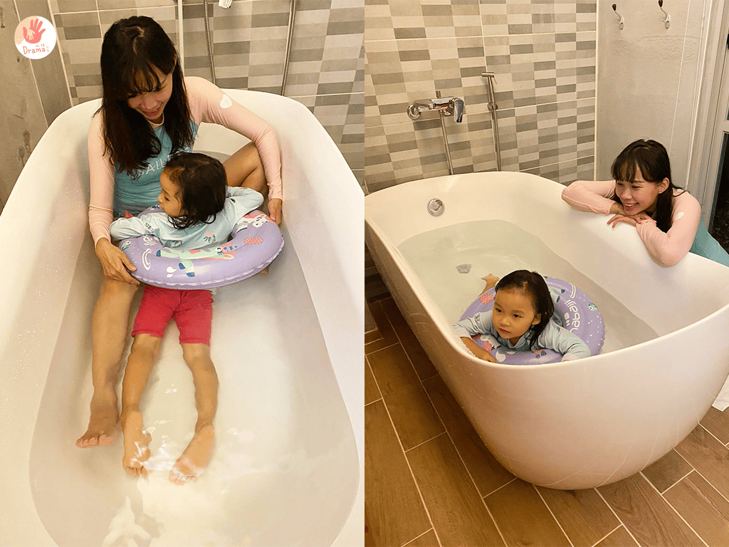 因為我們是晚上才到民宿,外面的泳池水很冰,我們就在浴缸偽游泳,實在太適合怕水的寶包暖身玩一下了
