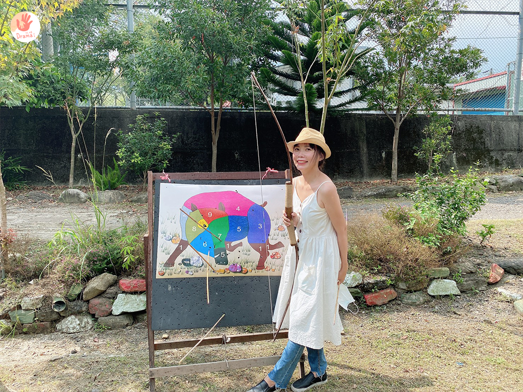 眼前的標靶是一隻山豬,分為不同部位不同分數,我們手握的弓是真的用竹子做成的,實際單手舉起瞄準手可是會發抖的