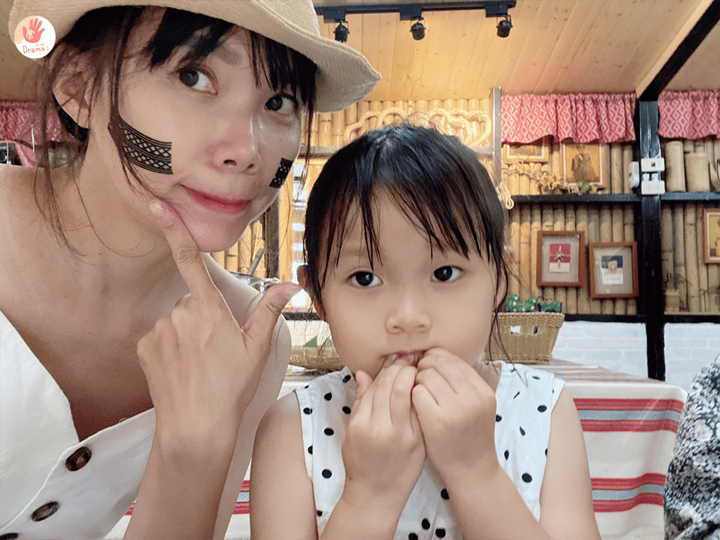 再來就是紋面的體驗,以紋身貼紙替代,男生是像梯子的圖騰,分別貼在額頭和下巴,女生則是貼在鼻翼的兩側,我們家寶包偶包很重,說什麼都不貼