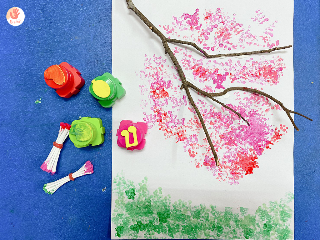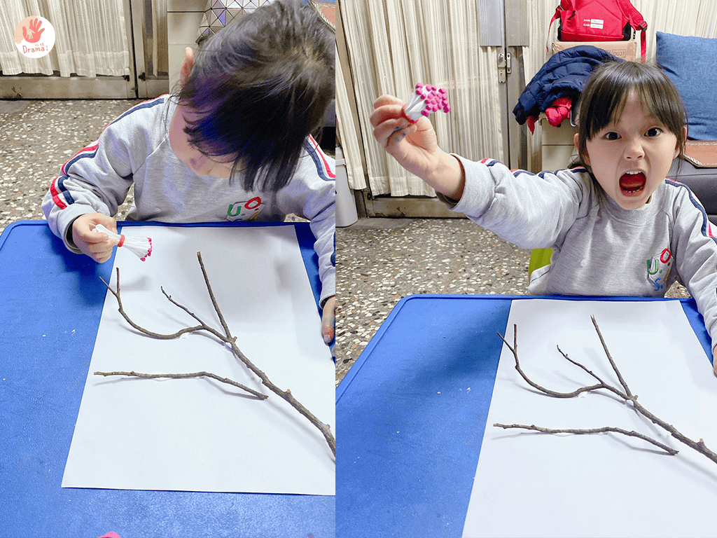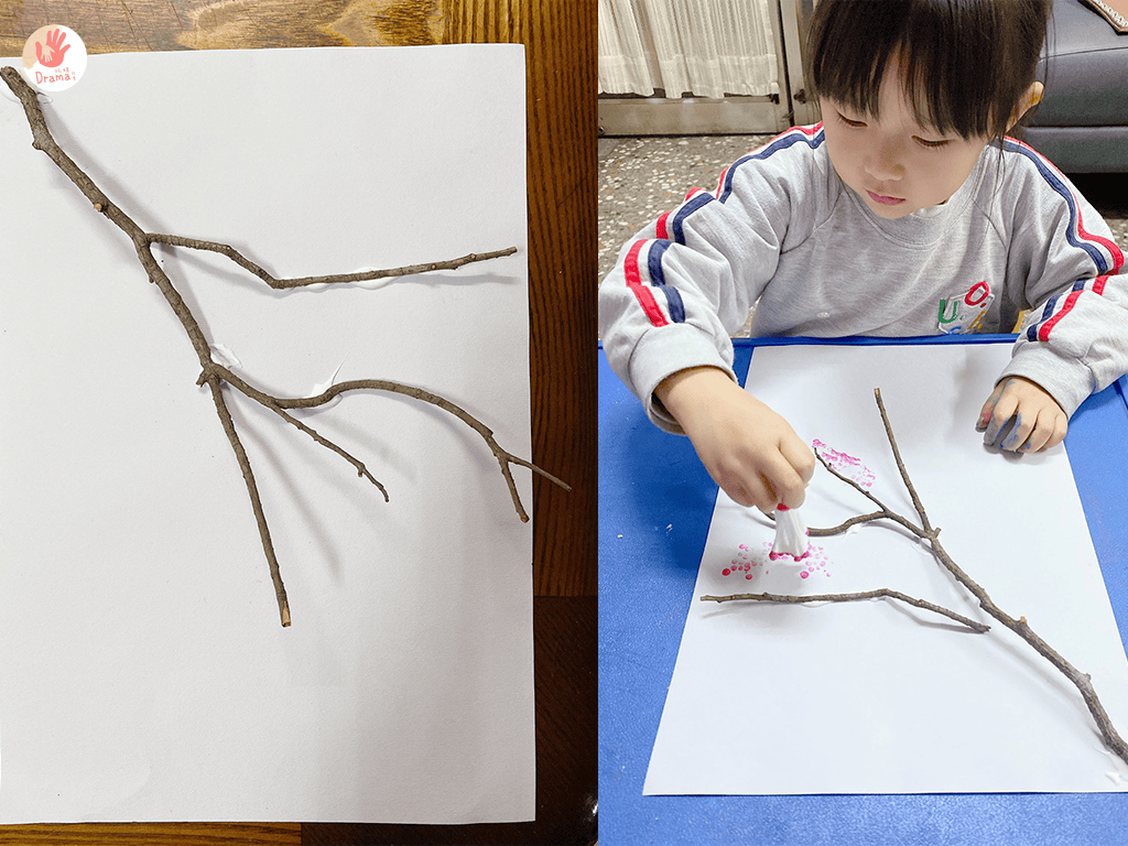 棉花棒大約二十支用橡皮筋綁起來,先沾上粉色顏料,開始在樹枝周圍綻放櫻花