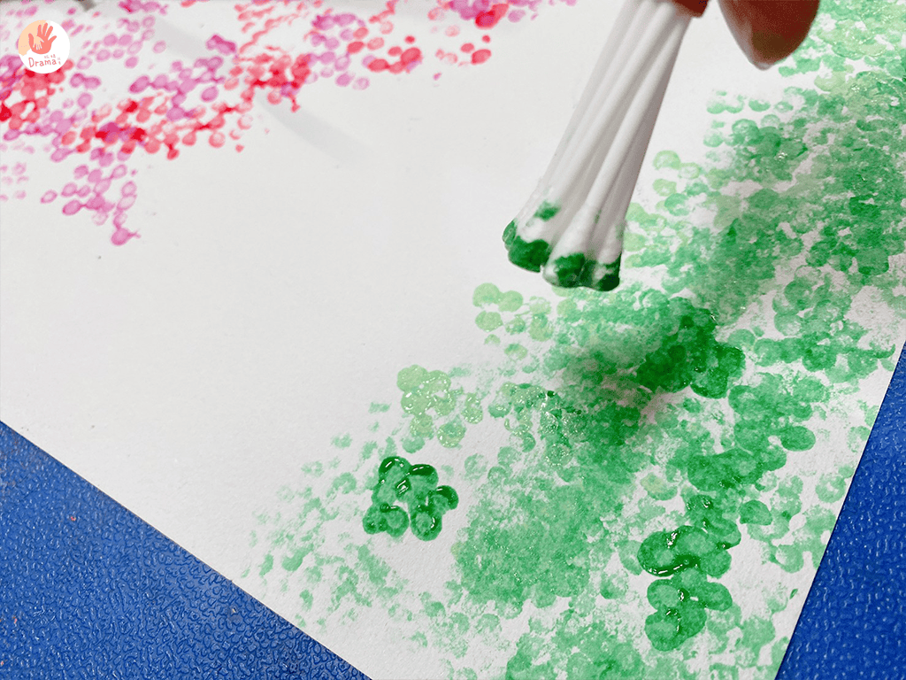 把先前減半的棉花棒另一頭沾上綠色顏料,作為草地,讓作品有更豐富的視覺