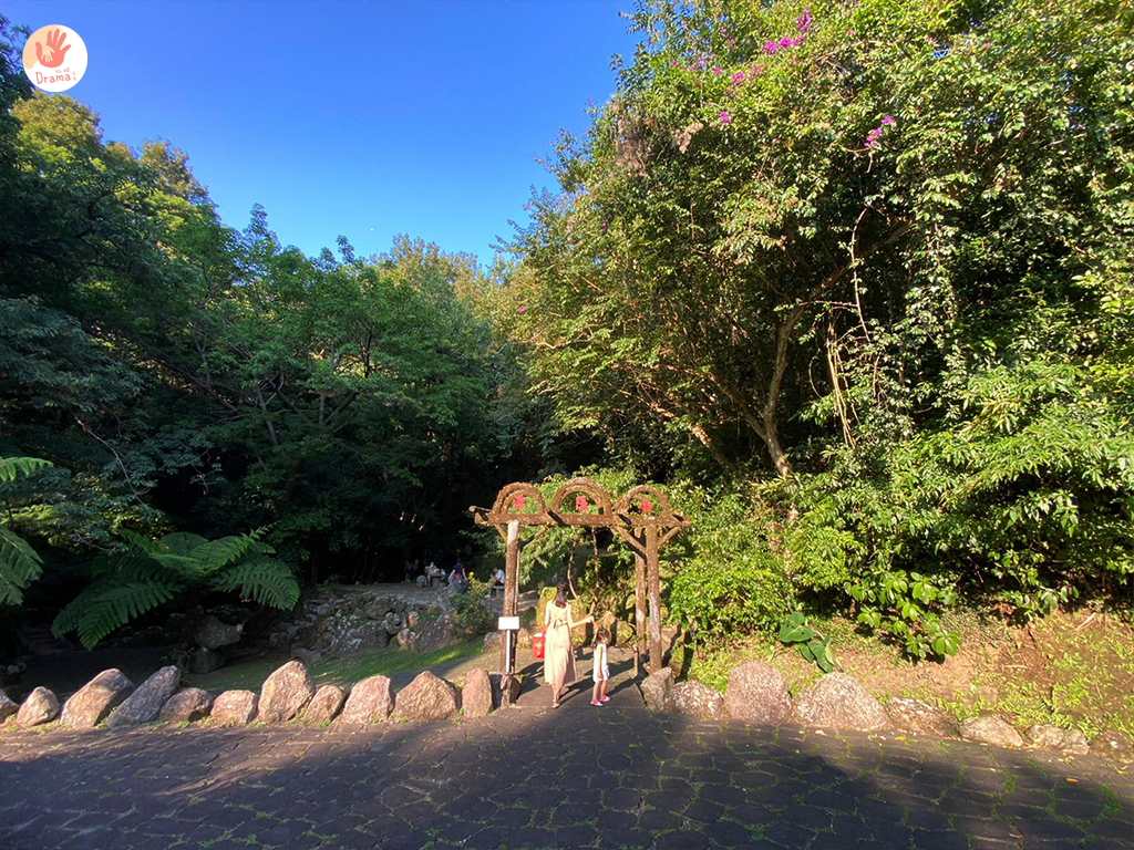[Google定位:中興嘟嘟房花鐘停車場]停車後往噴水池走去,或是直接往湖山路馬路邊線走過去,我們就是這樣走,還可以拍個石頭牆美照,就可以看到小隱潭瀑布了,而且完全不用爬山就可以看到瀑布美景,要親子戲水也是很方便,記得要做好防蚊