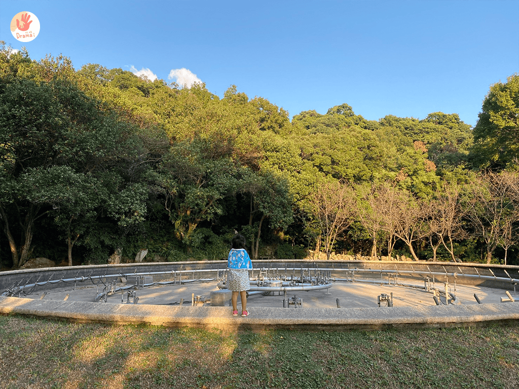 要去牽車時,跟爸爸說這邊就是噴水池,也可以從這邊過去,女鵝就說要過去看看,也在這裡拍了秋意濃的美照