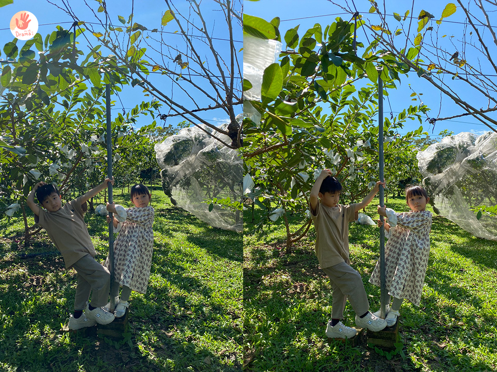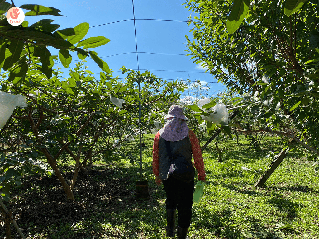 芭樂在很小剛冒出來就要趕快包起來,不然很容易就被蟲吃光光,這裡的芭樂是紅心芭樂,香氣十足,口感是軟的那種