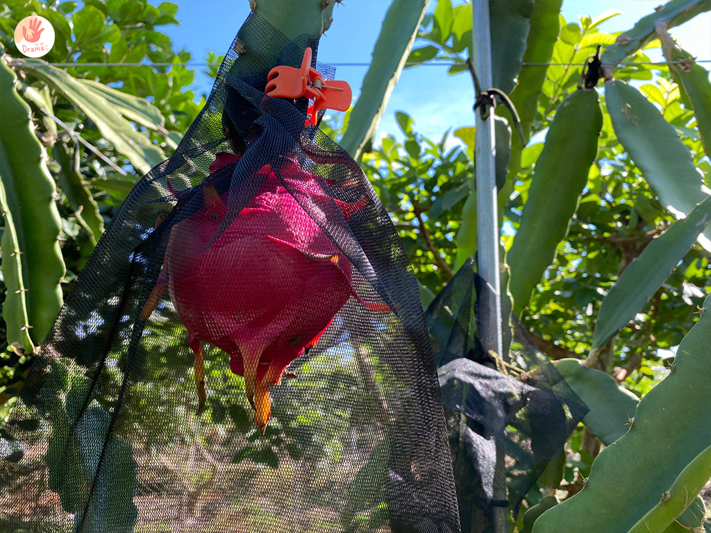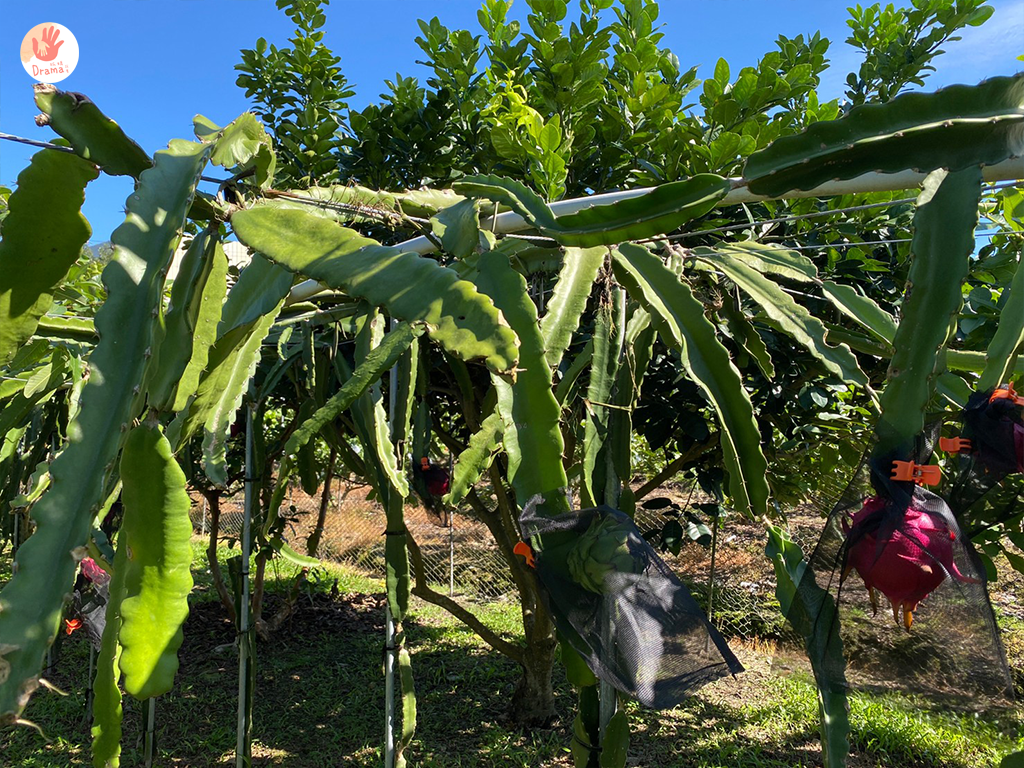 果園一旁有火龍果,我被火龍果的葉刺到頭,才知道原來火龍果的葉好像仙人掌呀,這個果園的火龍果也是一部分,所以果園種的很多元,也比較拍不出一致性美,比較農園體驗