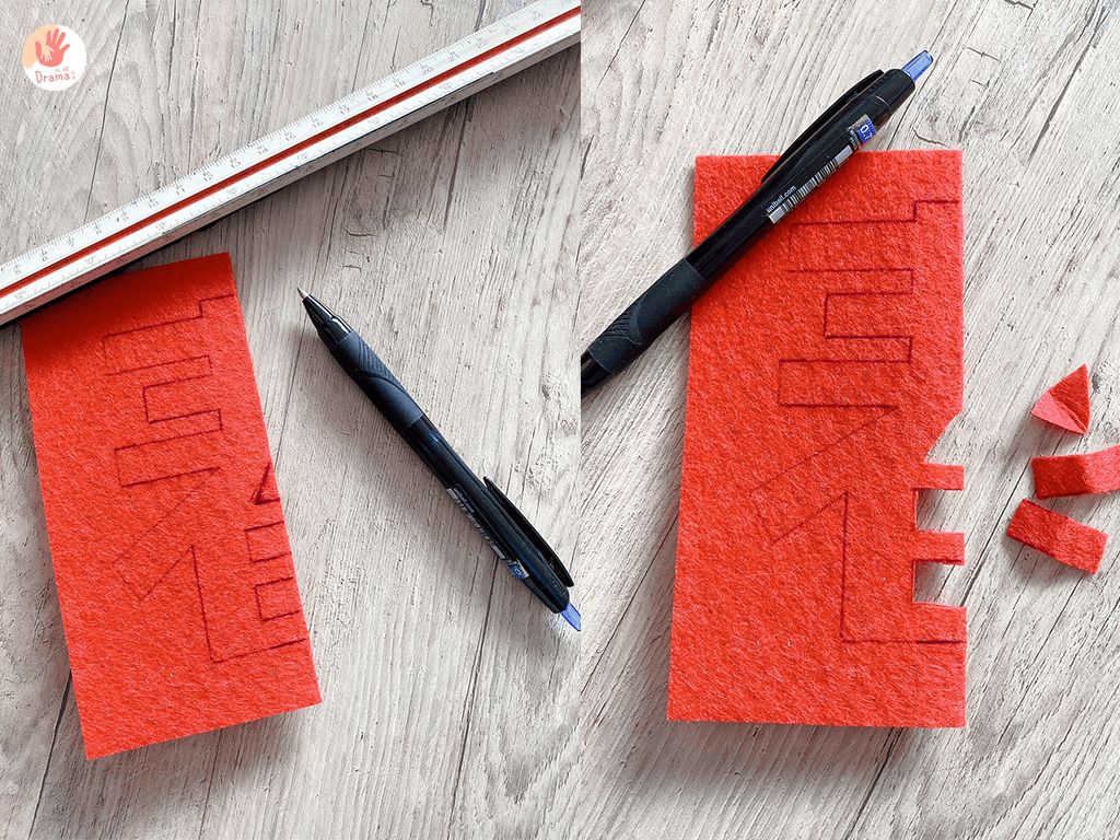可以用紅色的不織布也可以用色紙替代,先對摺用尺寫出一半的春字,這樣延線剪下來就是對襯的春字,本來是要讓寶貝剪的,但不織布寶貝力道還不夠,所以最後是抓媽全部完成