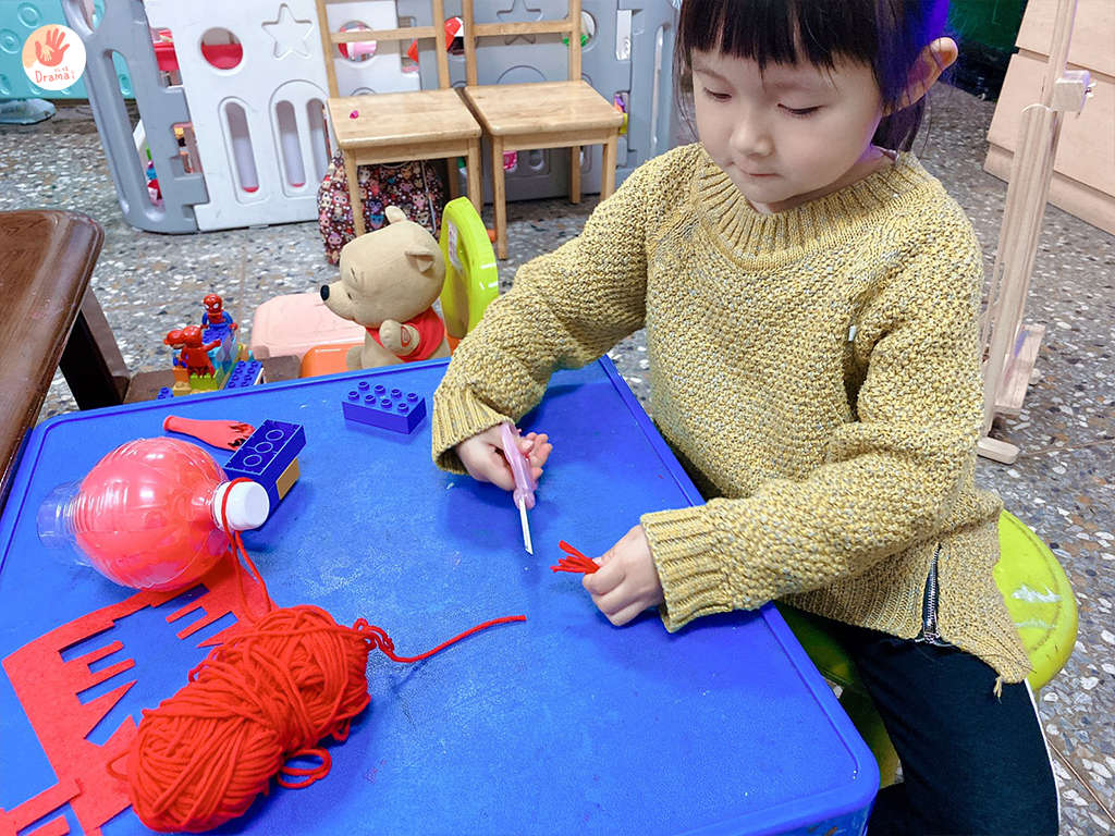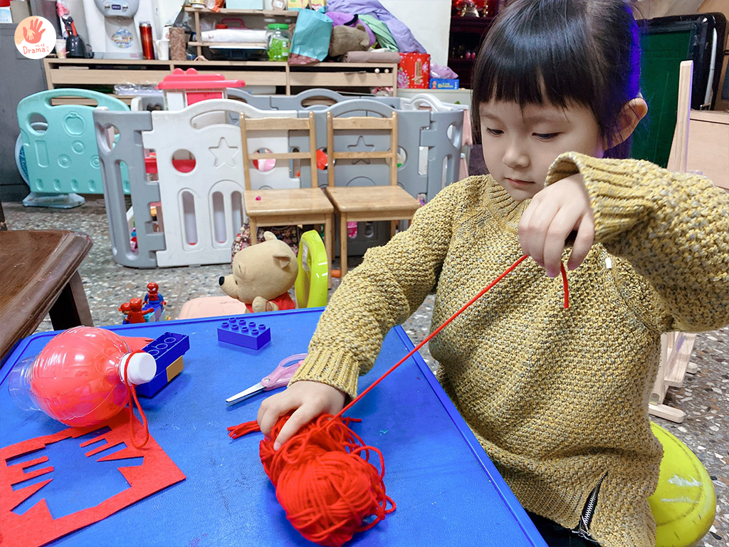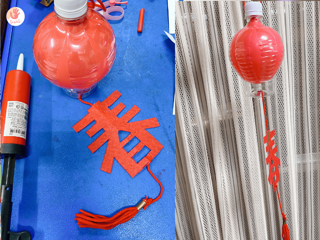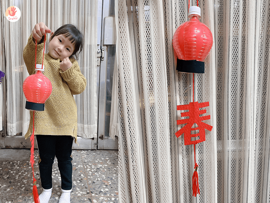 紅色毛線和瓶蓋轉進去,這樣就可以當燈籠的提把
