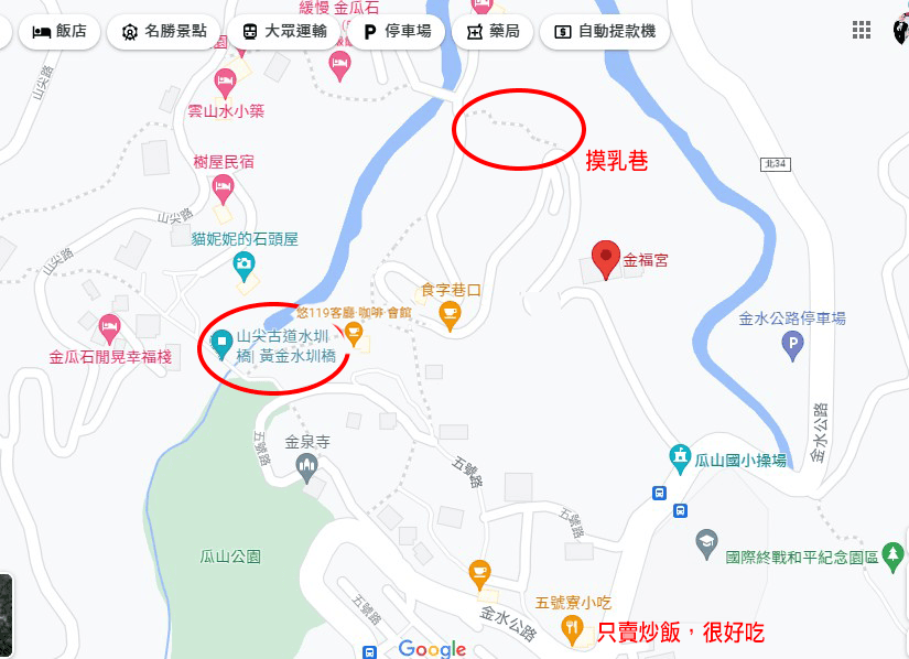 金瓜石[摸乳巷]導航搜尋/金福宮/(導航)走大約五分鐘就可以抵達石壁 [摸乳巷]