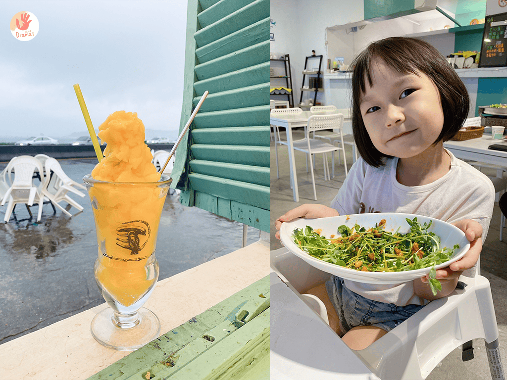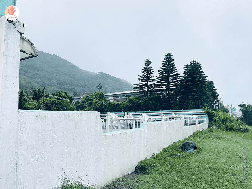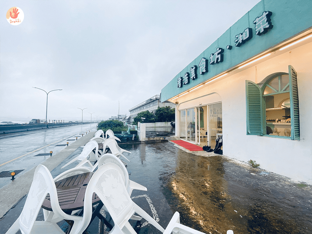餐廳前有桌椅,好天氣想曬曬太陽也可以選擇坐戶外,當天來下雨,但海依然在