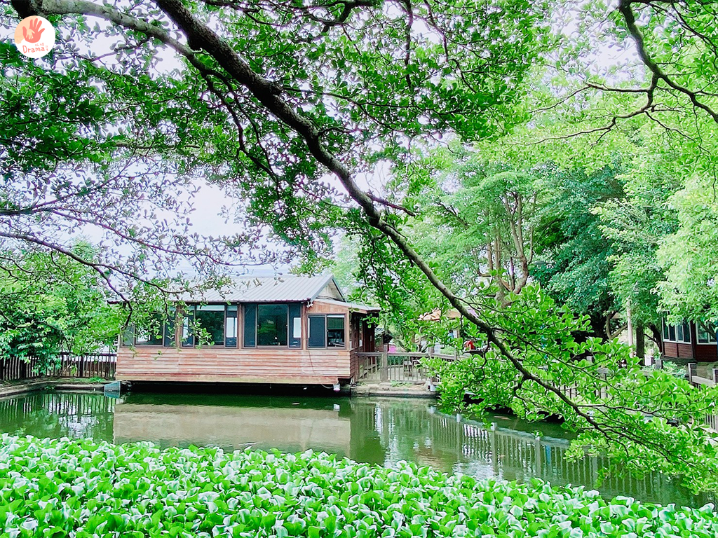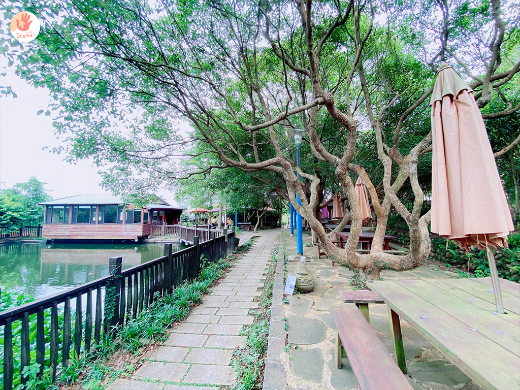 在農場也有一個小湖畔,湖畔旁還有小木屋也是一個用餐的地方都是大圓桌