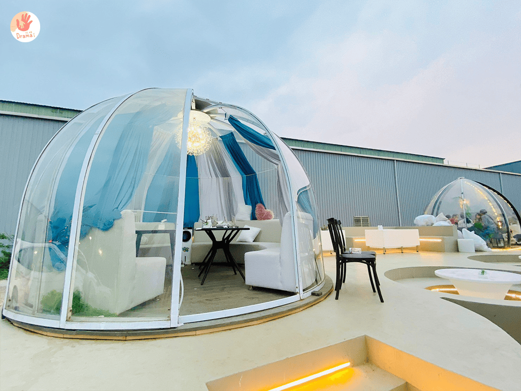 室內是貨櫃玻璃屋,桌型以四人方桌為主,靠窗區有情人雅座區