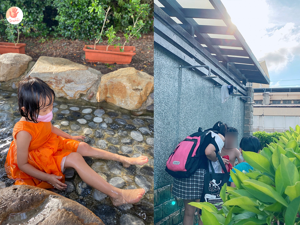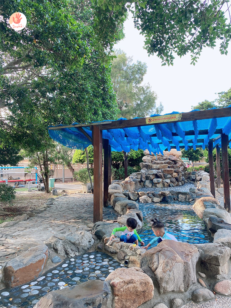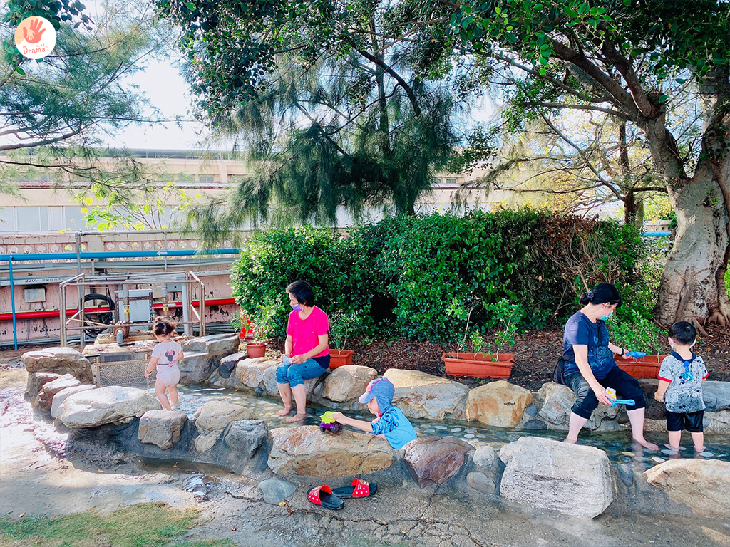 這邊的水也閉園水就會放掉,還不想走的孩子找到角落的積水區繼續玩