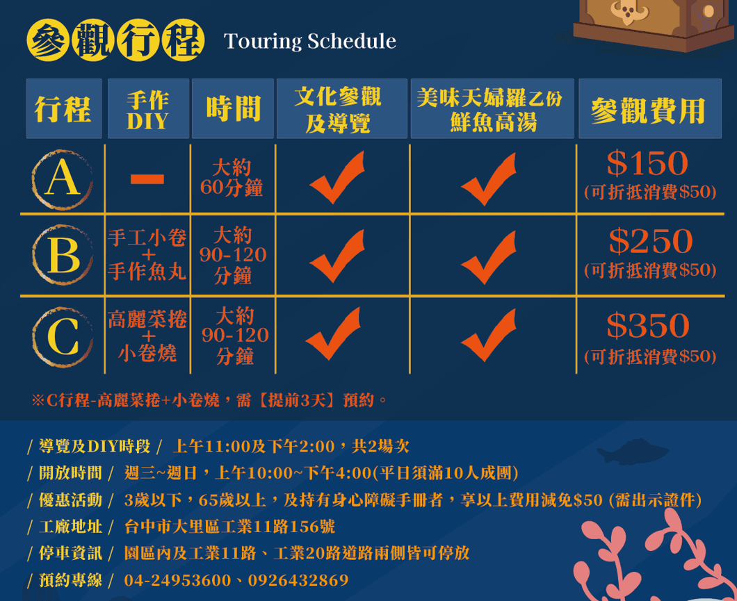 - 導覽及DIY時段:上午11點及下午2點(線上預約表單,點這裡)(平日成團人數最低10人,假日不限)