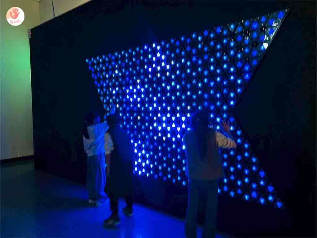 [光影魔法美術館]鼓勵大小朋友手舞足蹈,以「手、腳、身體」體驗光影、音效與數位科技的奇幻結合,成為光影魔法師,入口第一個遇到的是~流光之波×藍色的光從指尖傳來