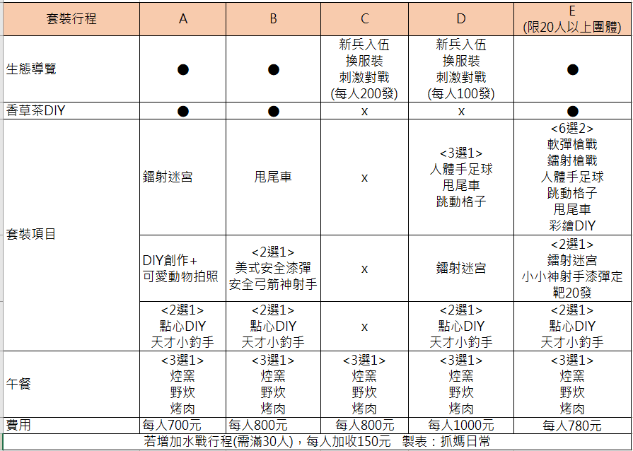 [亞太生態園區]套裝行程就有5種,另外也有針對公司或學校團體有不同的方案,這次我們出遊12大7小選擇了活動套裝行程E,適合4歲半以上的小朋友,因為我們這次出遊最小的就是4歲半,自己開卡丁車也沒問題喲~~~繼續看下去,抓媽最後有整理5種套裝行程及價格