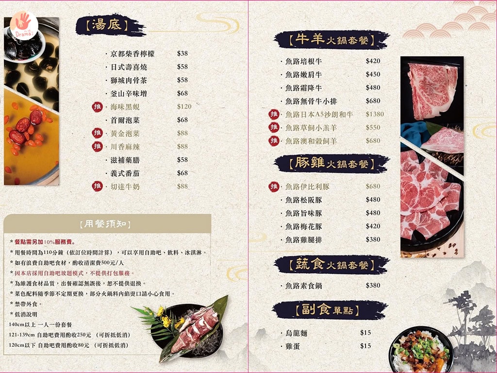 [魚路小棧精緻鍋物]消費是依點的肉品套餐價格,另外小朋友依身高120公分以下,自助吧收80元可以抵單點,121-139公分收250元也可以折單點,這裡的蛤蜊10顆39元,超級無敵便宜,我都要懷疑是不是印錯了